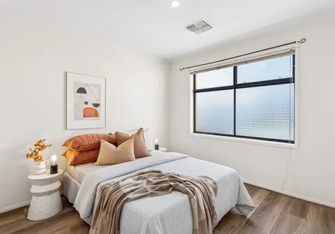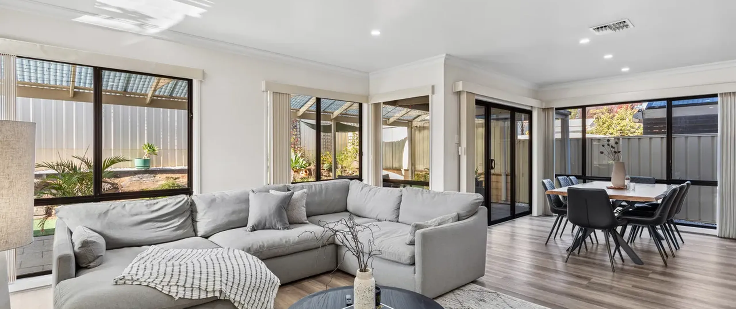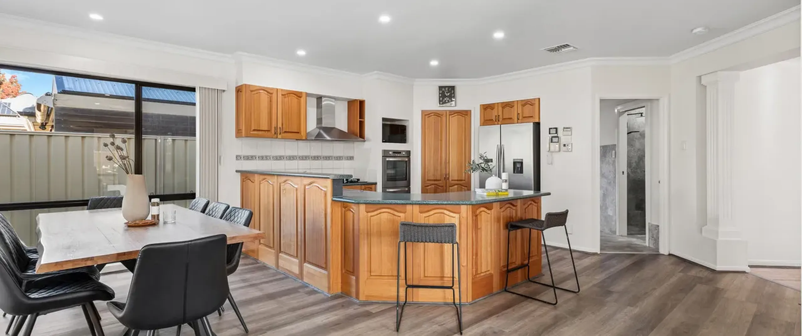 - Open-plan family and meals space with on-trend neutral timber-look flooring and sliding door access to the rear yard