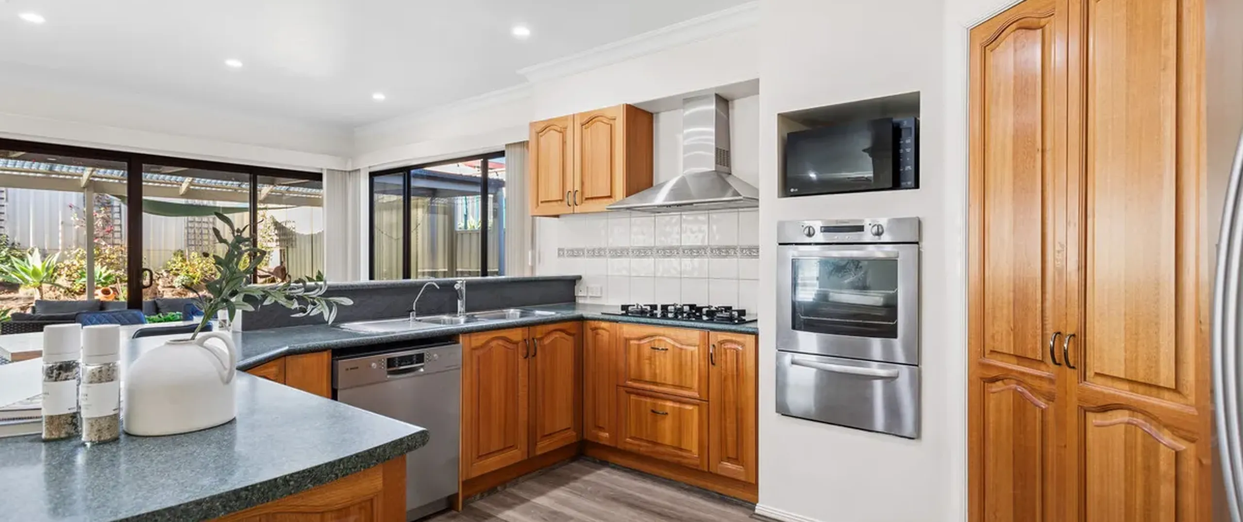 - A well-appointed kitchen with Tasmanian Oak cabinetry, stainless steel appliances including a gas cooktop, dishwasher and oven with warming drawer, ample storage and bench space and a breakfast bar