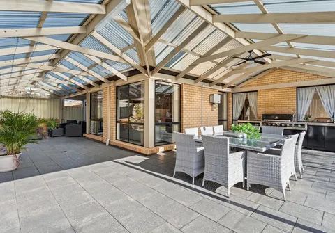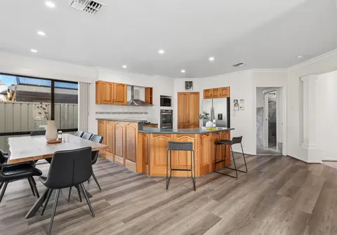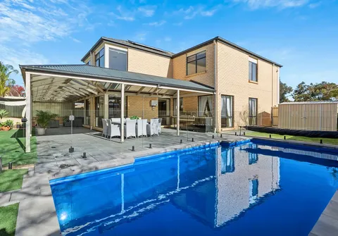 With its commanding street presence, immaculate façade, low-maintenance landscaped gardens, and elevated position, the home makes a striking first impression. The open-plan family, meals, and kitchen area is perfect for everyday living, while sliding glass doors lead to an expansive outdoor entertaining space complete with a large pergola, outdoor kitchen, and sparkling in-ground swimming pool, an entertainer’s dream.