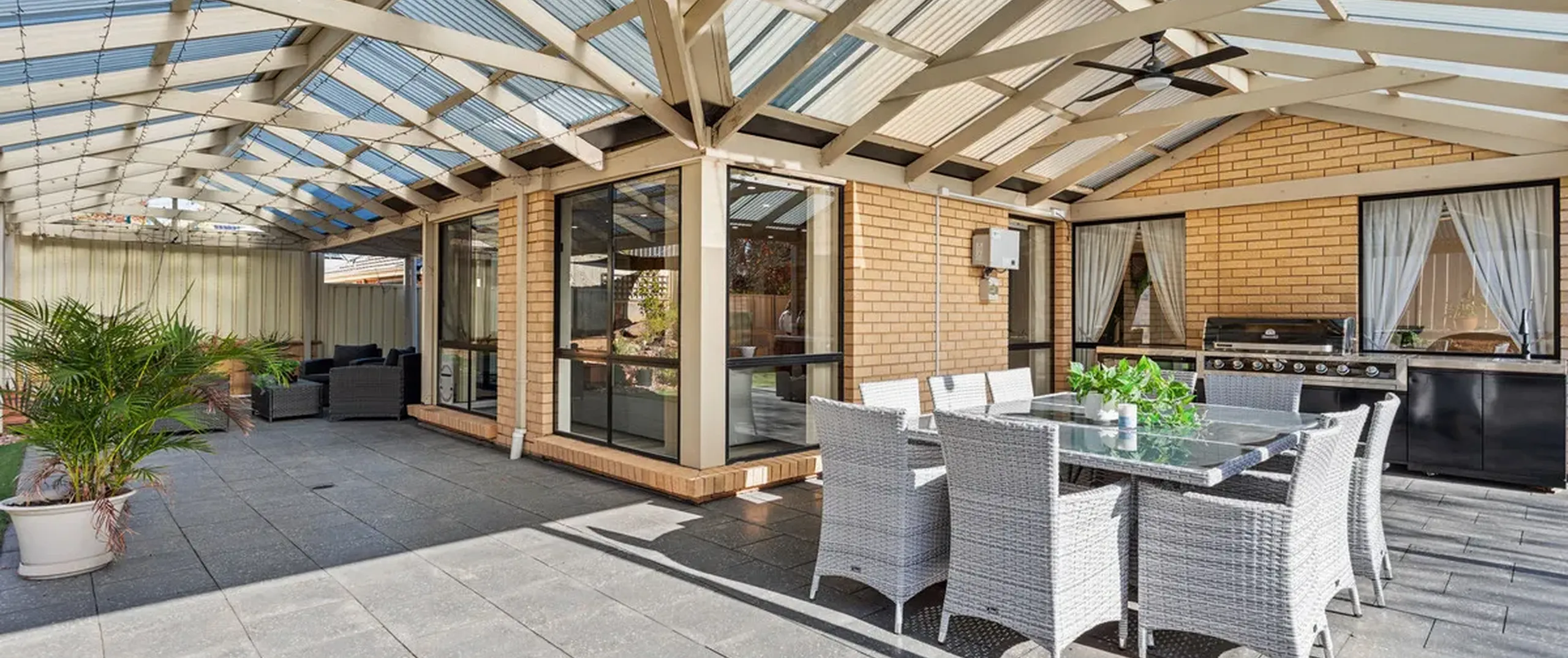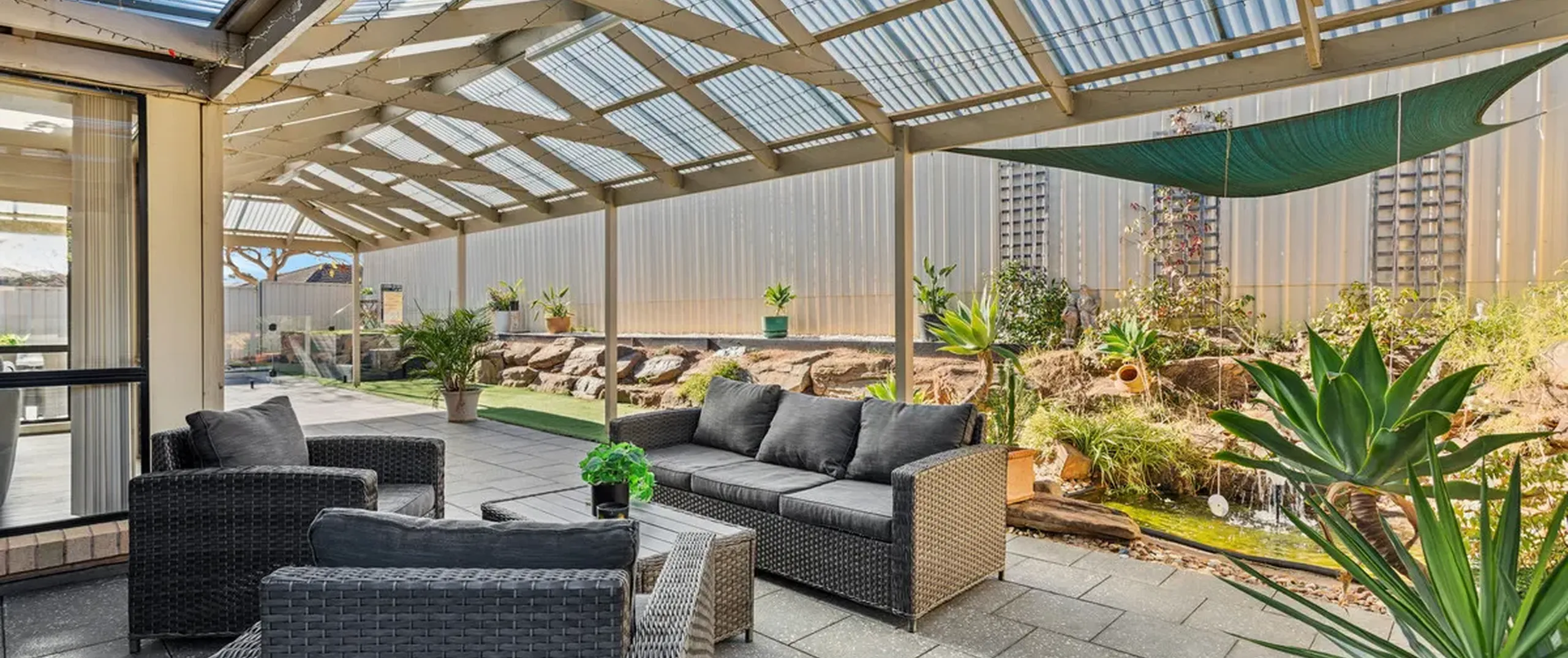 - An impressive outdoor entertaining area with large L-shaped pitched roof pergola, outdoor kitchen with barbeque, ceiling fan and powered water feature pond, the perfect space for entertaining