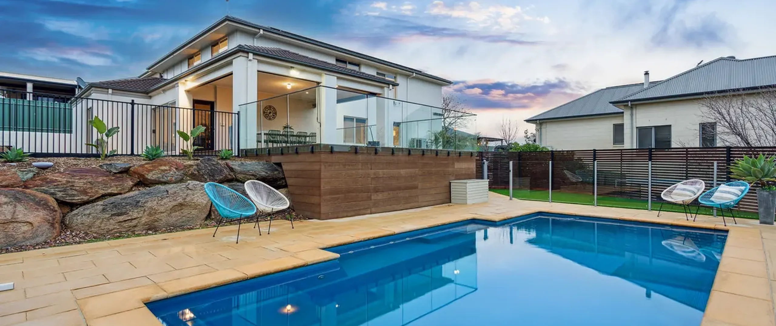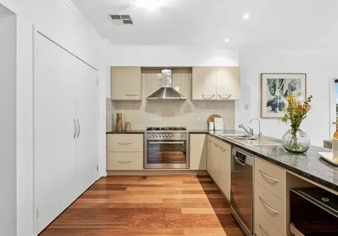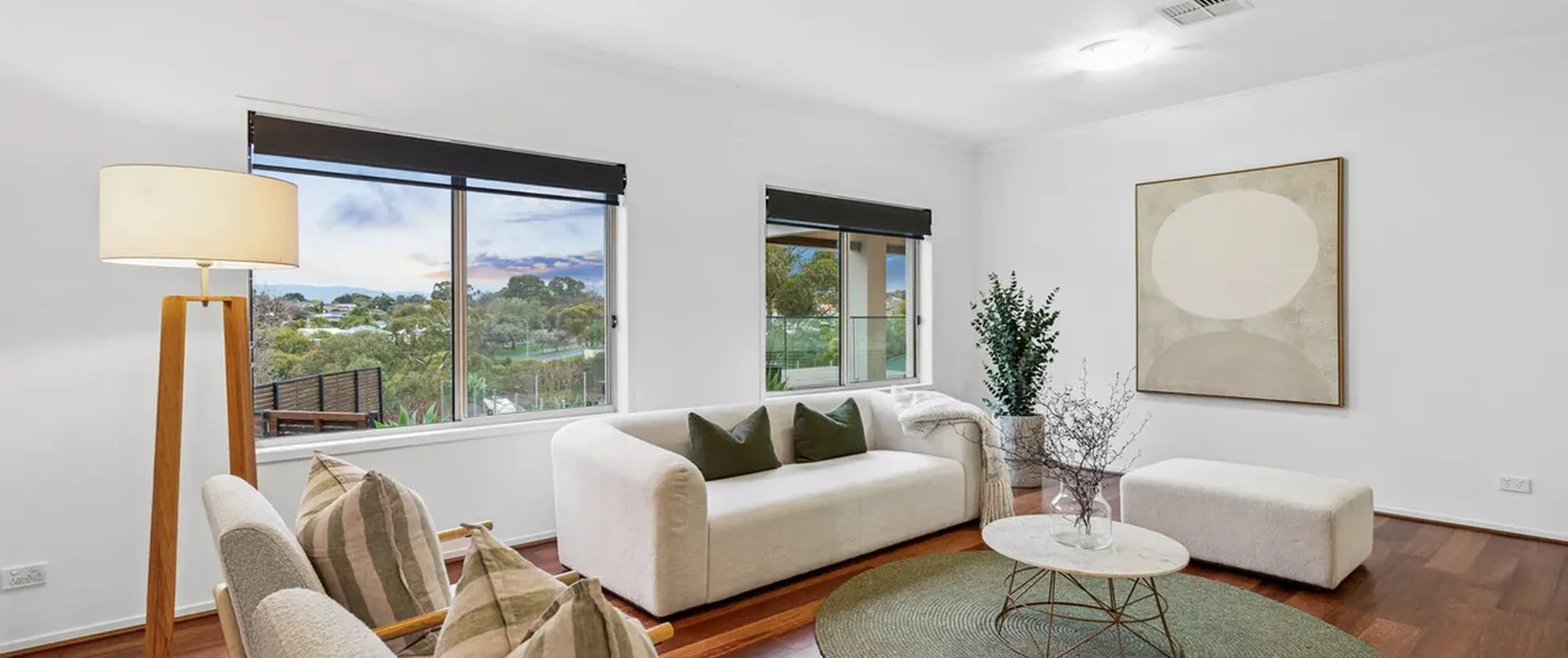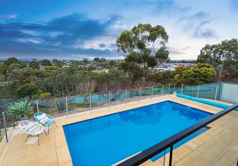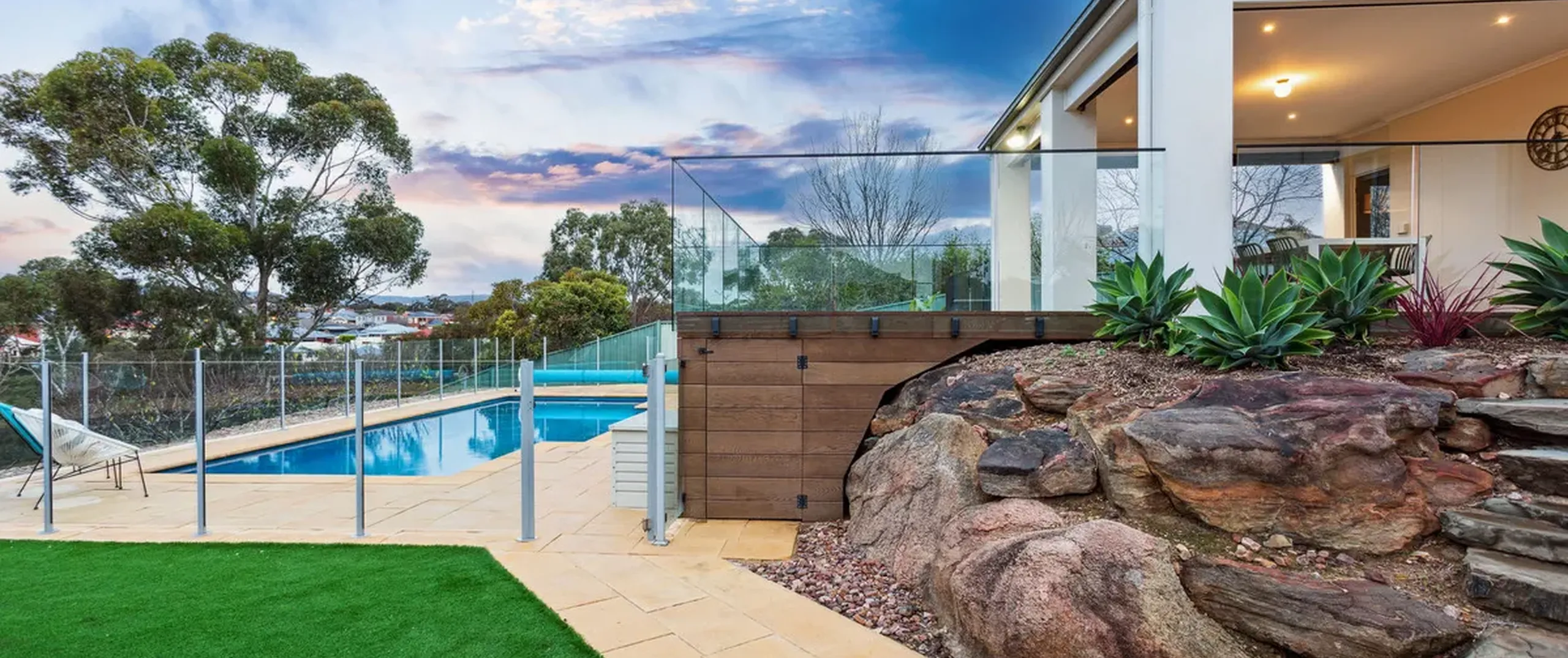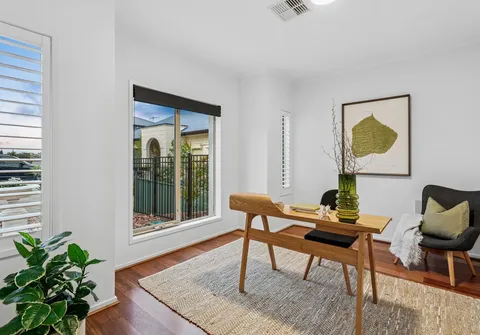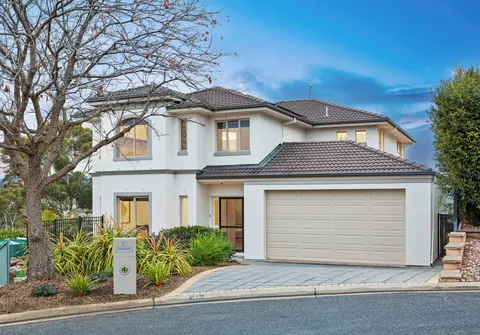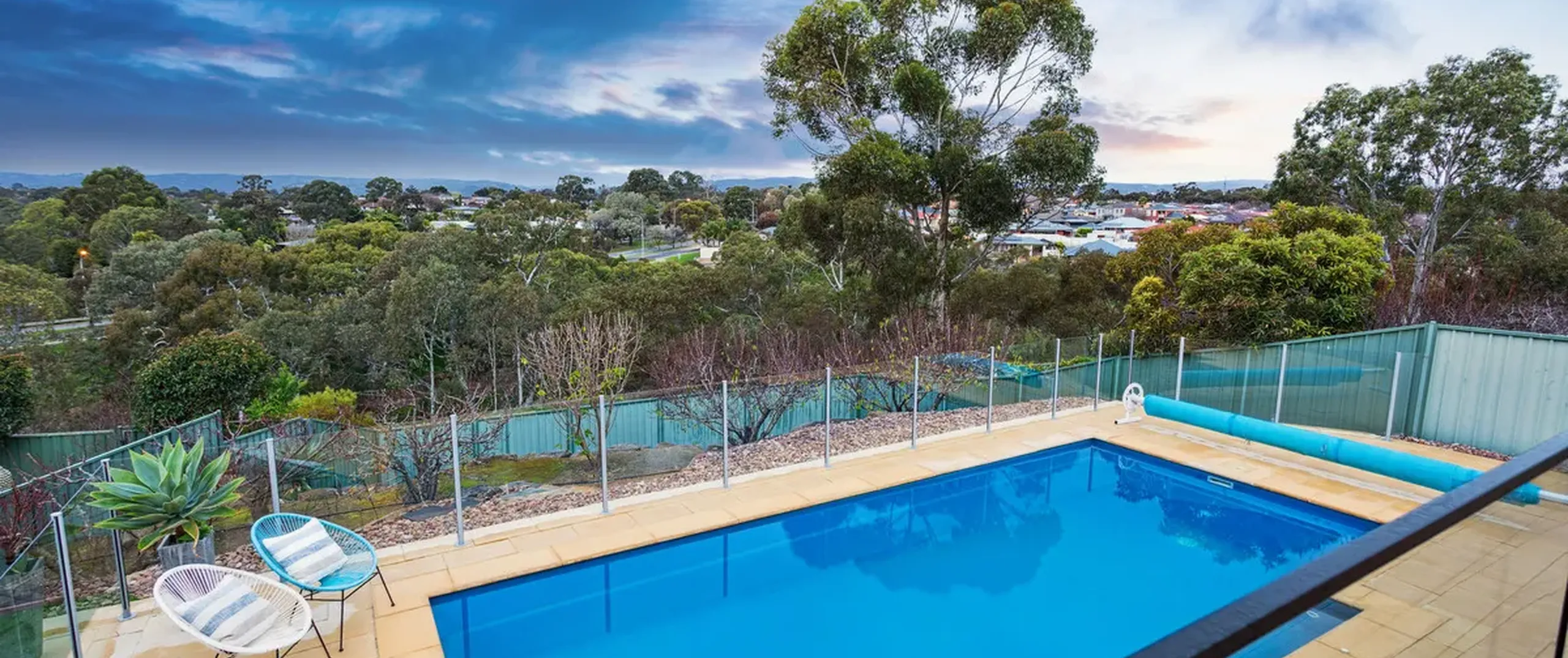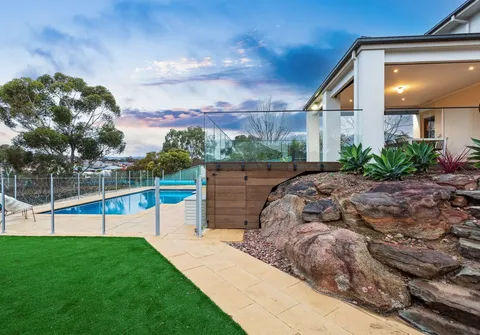 Step outside to discover a magnificent decked alfresco with roller blinds, a perfect space for gatherings that spill from summer evenings into starry nights. Here, the glass balcony ensures uninterrupted views across treetops to the Adelaide Hills, while the sparkling 9-metre swimming pool becomes an irresistible retreat throughout summer. Lush, easy-care gardens and a suite of comfort-driven inclusions add further refinement and ease to daily life.
