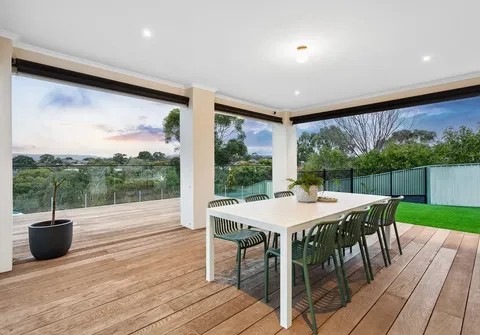 - Decked alfresco entertaining area with roller blinds for year-round comfort and views to hills