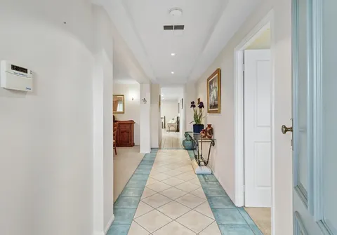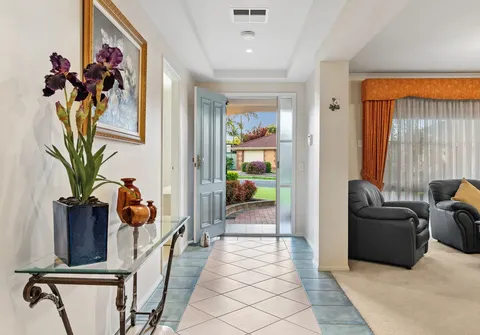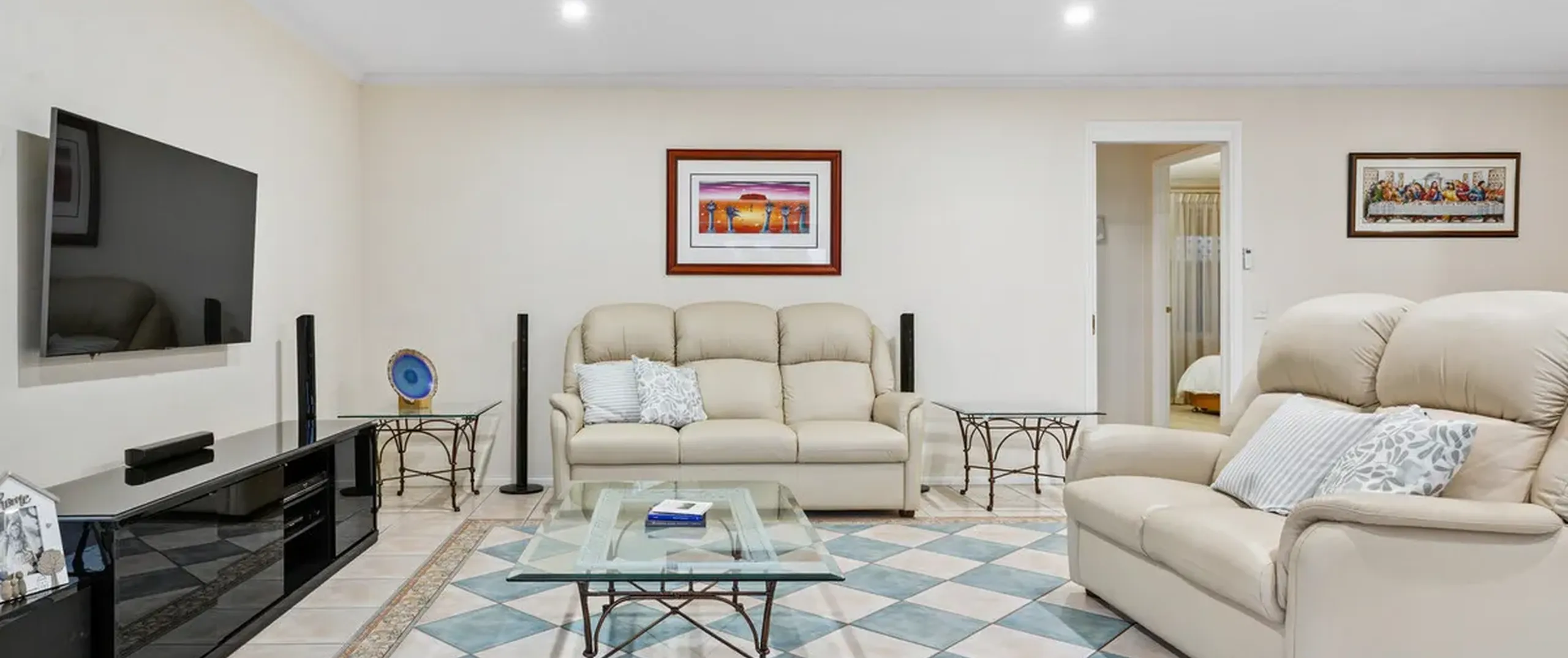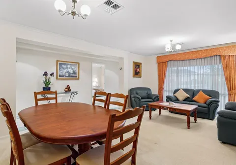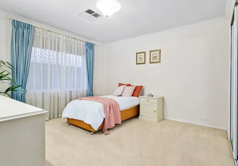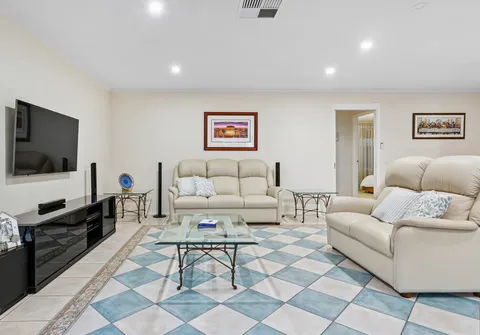 Two distinct living zones offer versatility, while a separate wing ensures privacy for the bedrooms. The master suite is a true retreat, complete with his and hers walk-in robes and a spacious ensuite, and three additional bedrooms, all with built-in storage, provide ample space for the family. Natural light floods the open plan living and dining area, complemented by electric blinds, LED downlights, and effortless flow to the outdoor entertaining space.
