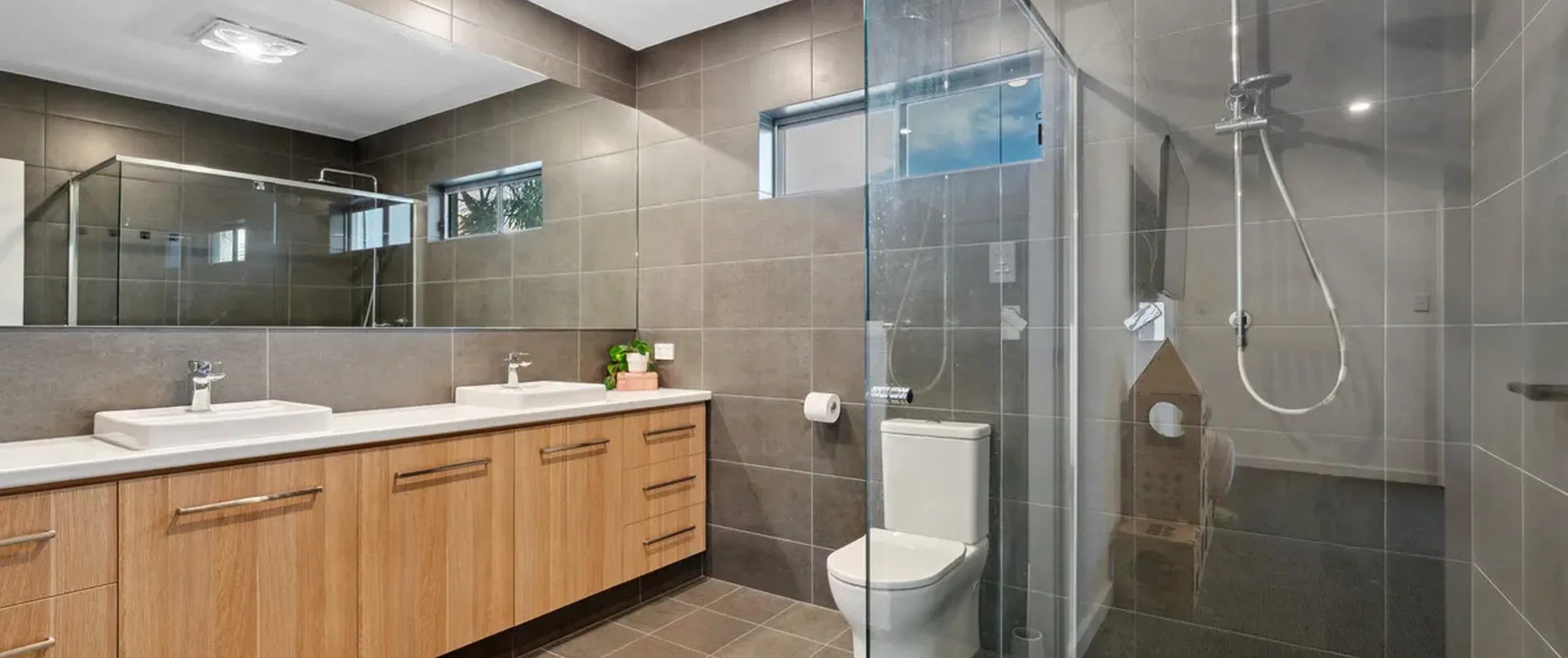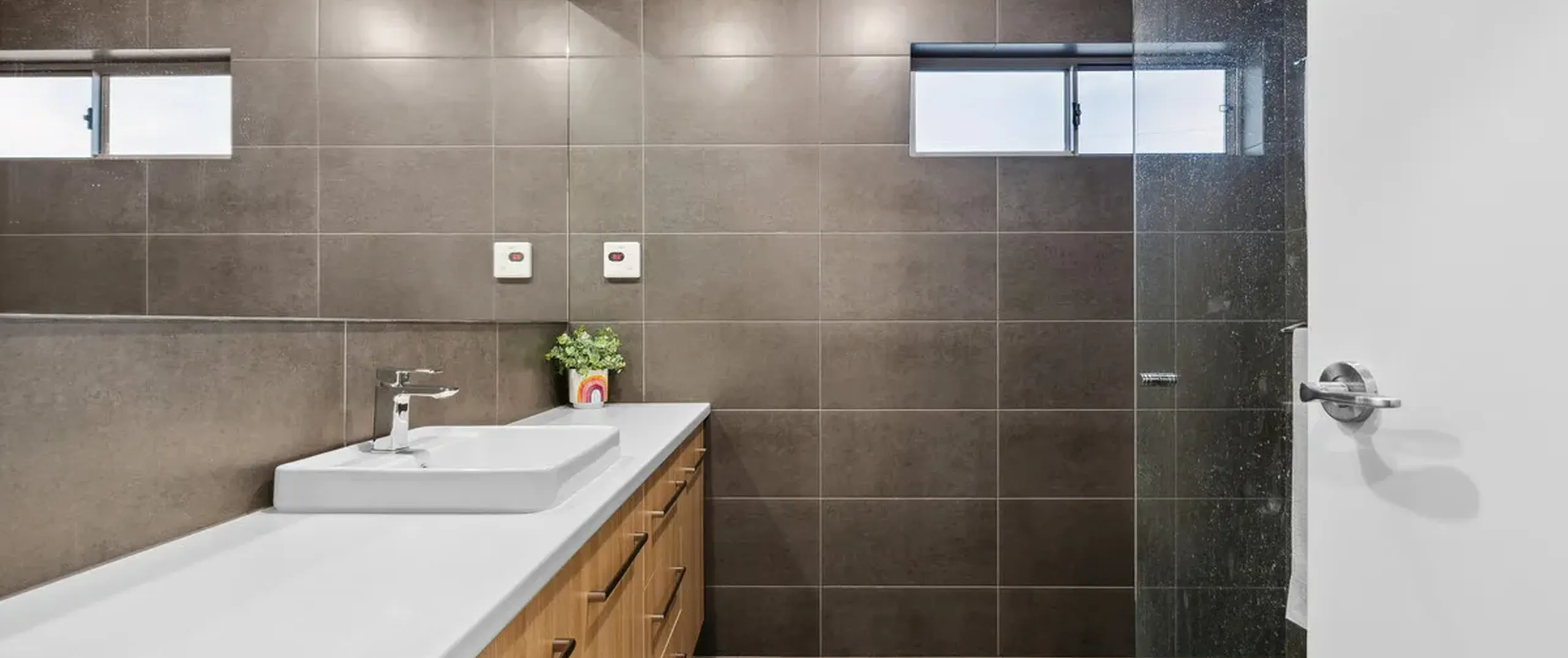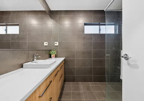 - Spacious modern bathroom with floor-to-ceiling tiles
