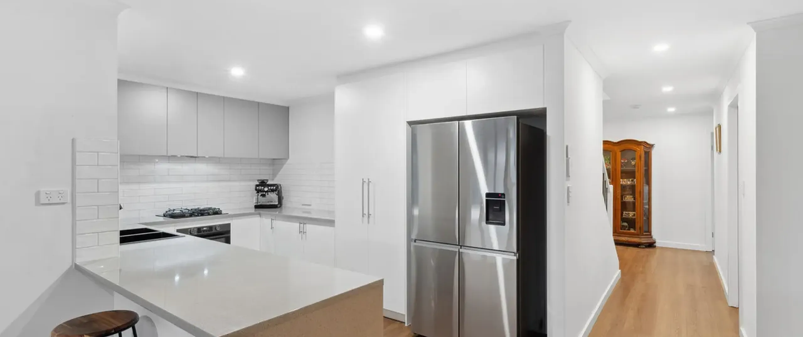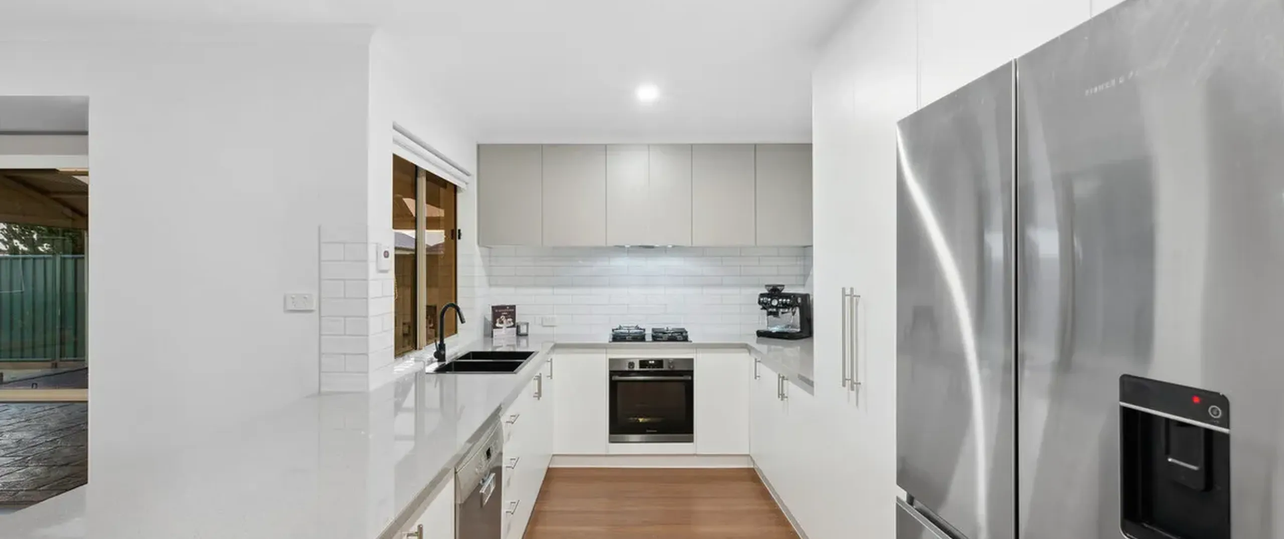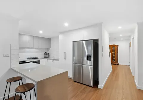 As you approach the residence, you'll be welcomed by an eye-catching facade paired with pristine gardens that set the tone as you enter the home. Follow the easy-care warm flooring past the formal lounge which effortlessly flows through to an inviting and light-filled open-plan kitchen, living and dining area with a stunning bay window adding to its charm. The thoughtfully designed kitchen is certain to make any passionate chef feel completely at ease with high quality finishes, stainless steel appliances, an abundance of cupboard space, and a desirable breakfast bar for a casual seating arrangement.
