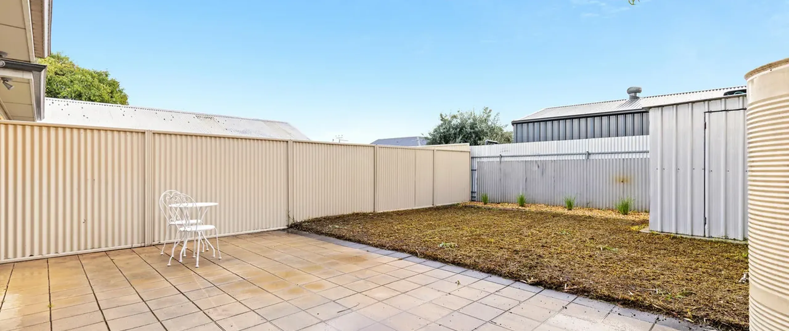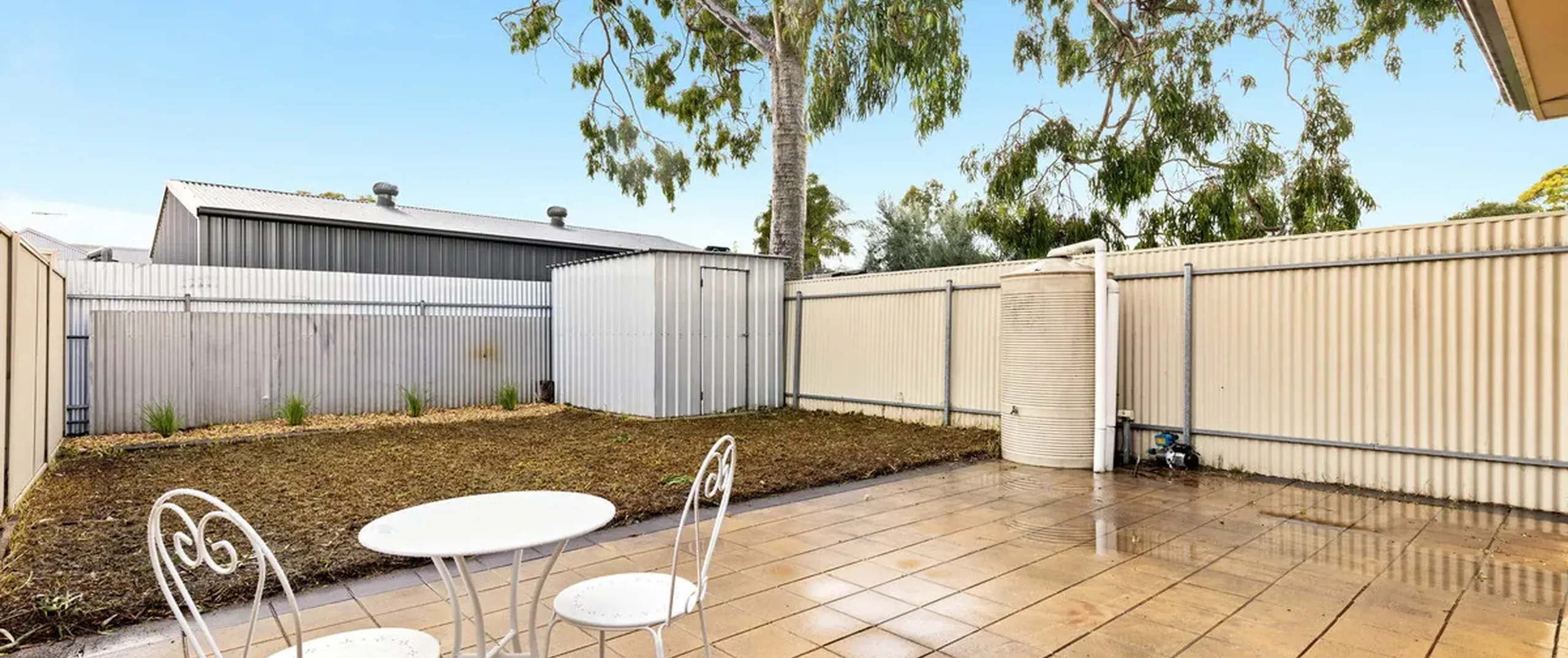 - Low-maintenance paved outdoor area with rainwater tank and tool shed