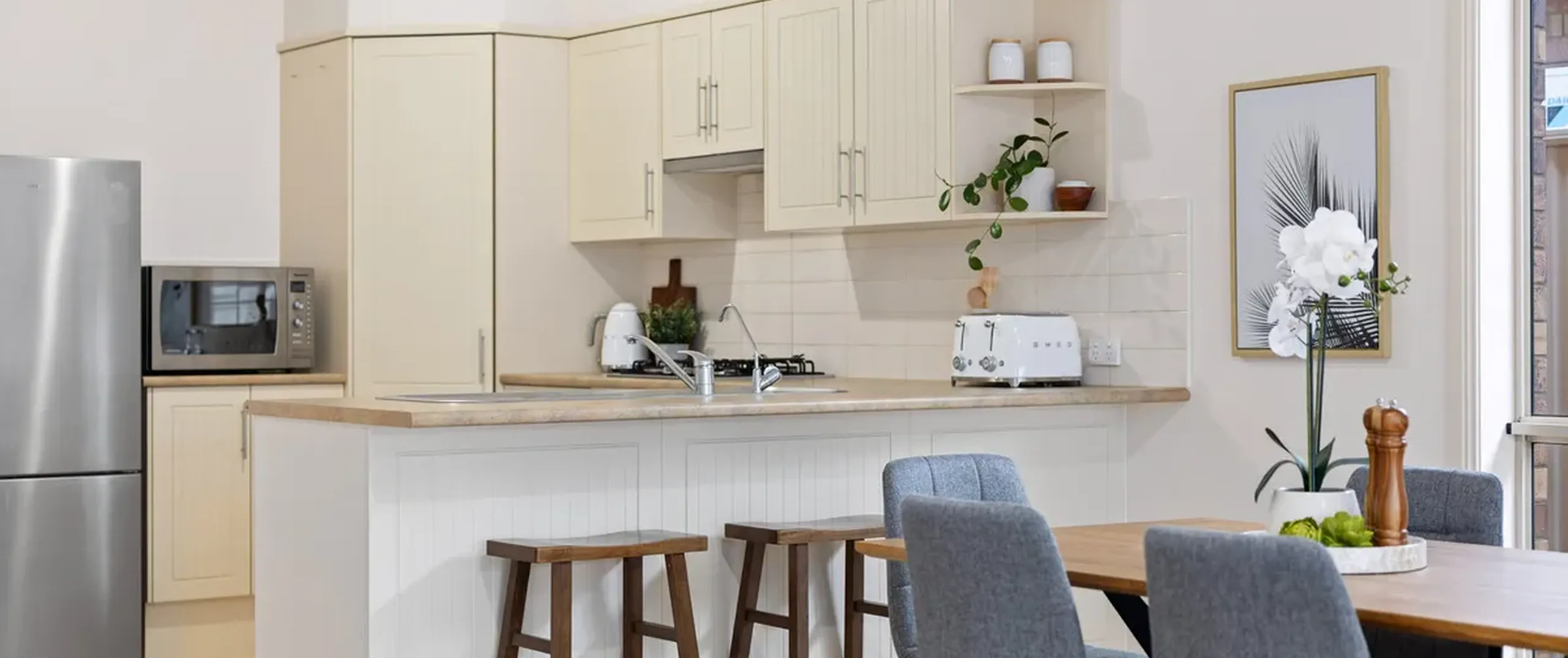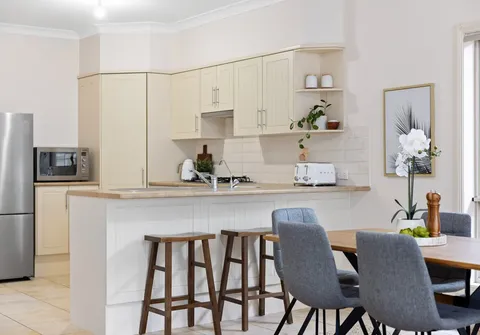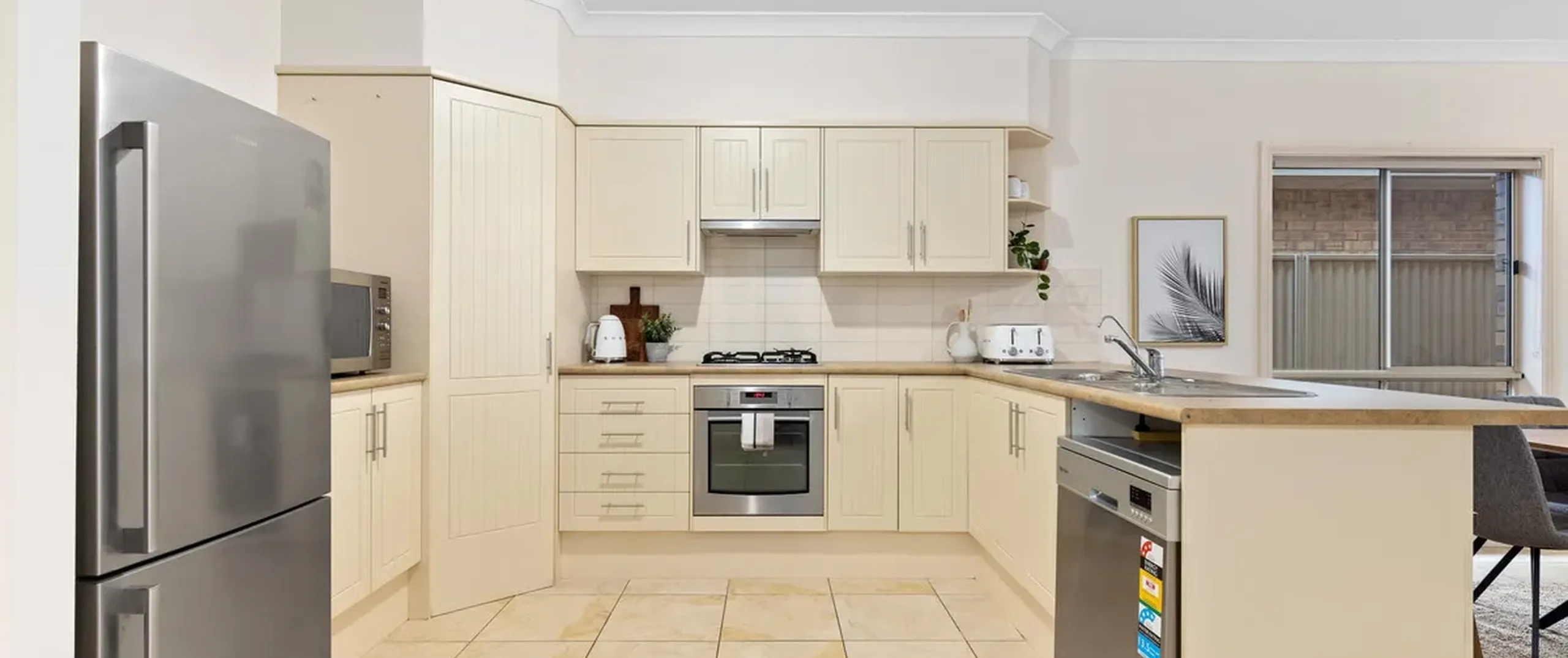 - Timeless kitchen with gas cooktop, stainless steel appliances including a dishwasher, pantry, ample cupboard space and sweeping benchtops with breakfast bar
