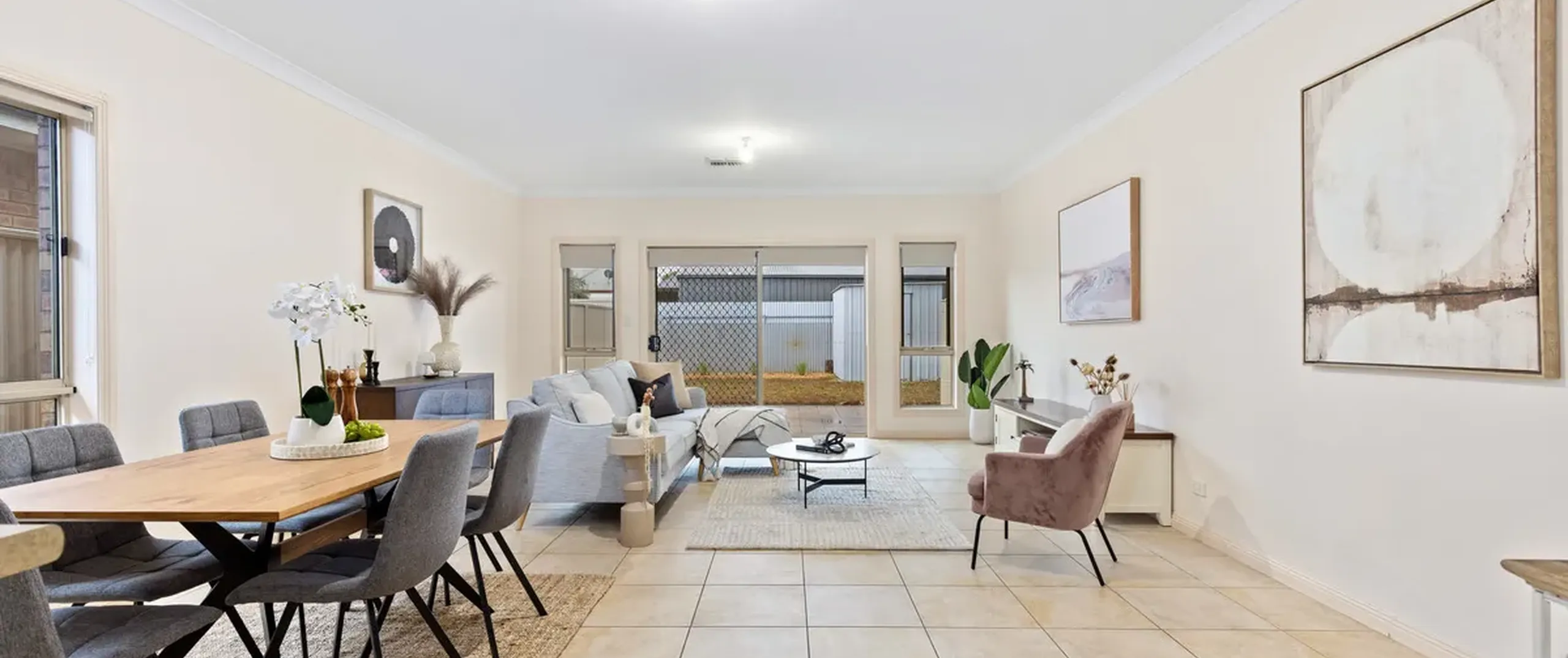 - Light-filled open plan, living, dining and kitchen with easy-care tiled flooring and sliding doors opening to outdoor area