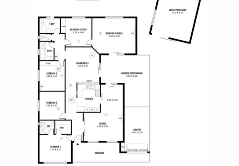 - Carport with automatic panel lift door with space for up to 4 cars behind, built in shelving and drive through access