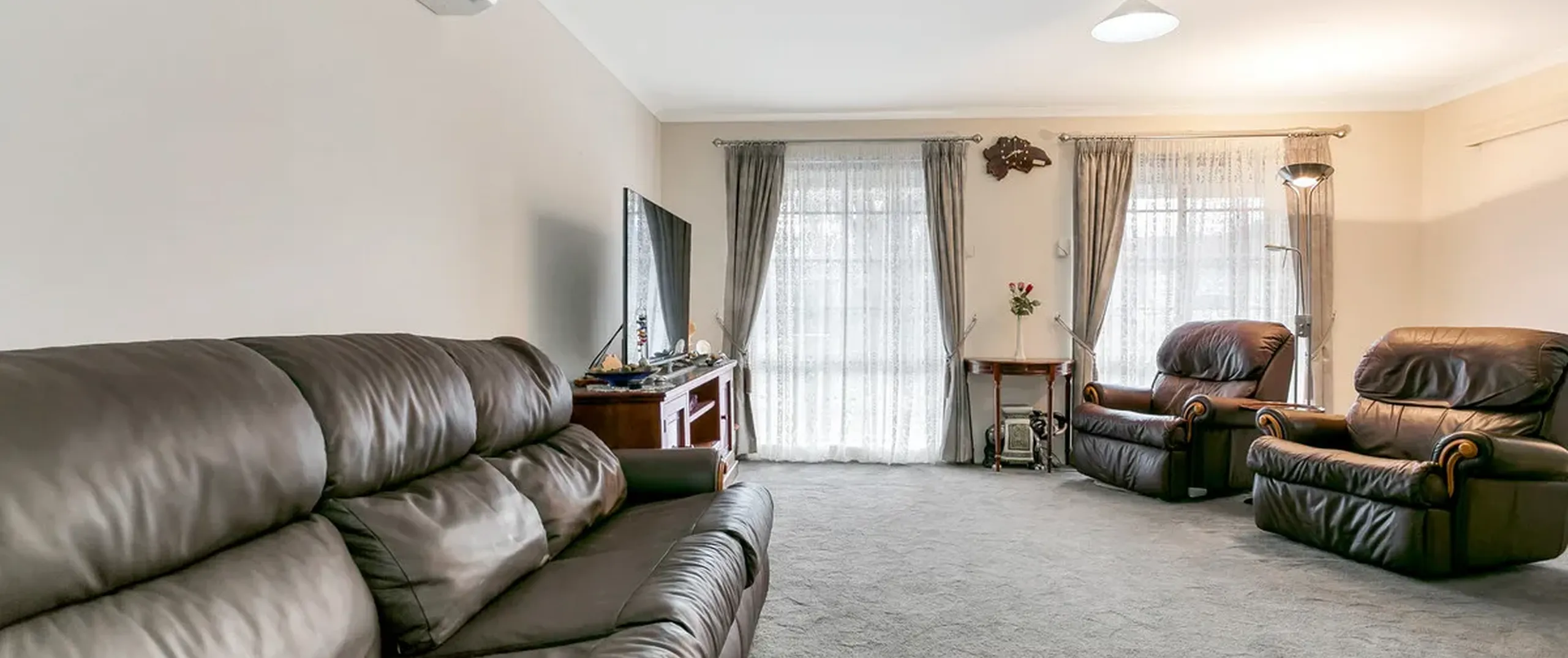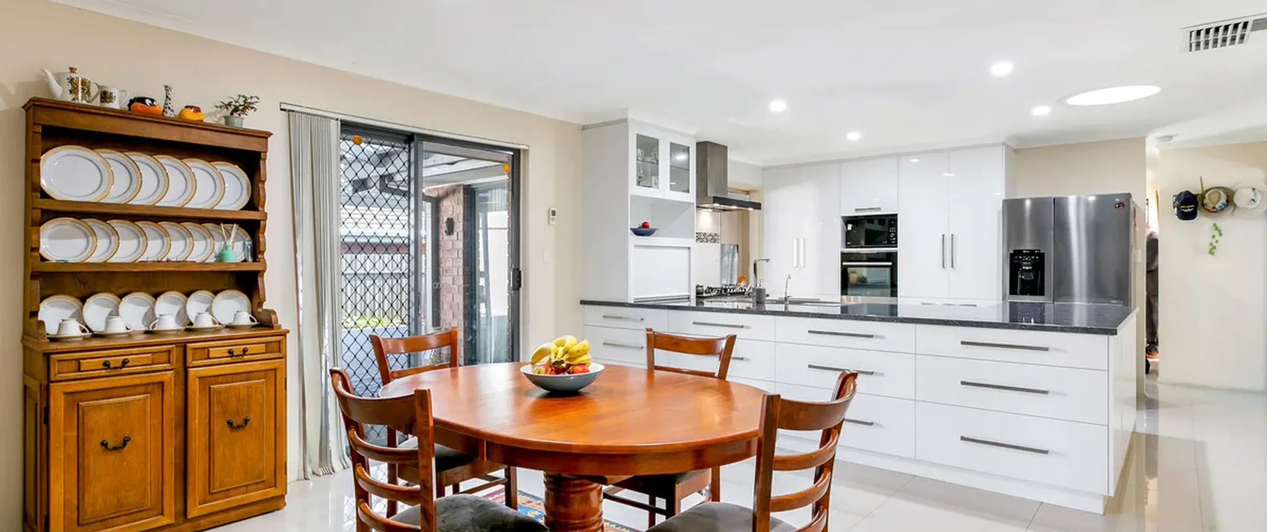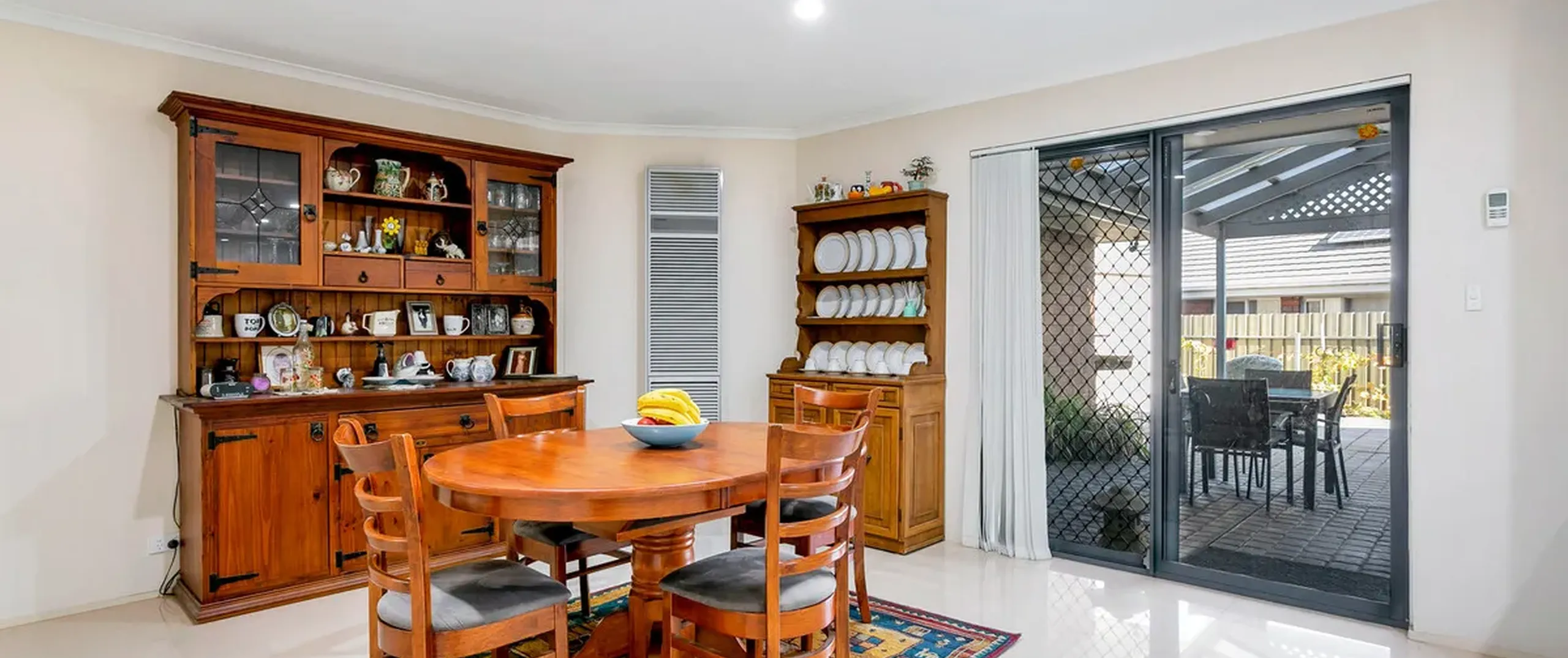 - Open plan, living/meals area with gas heater and sliding door access to the 3-way outdoor entertaining area