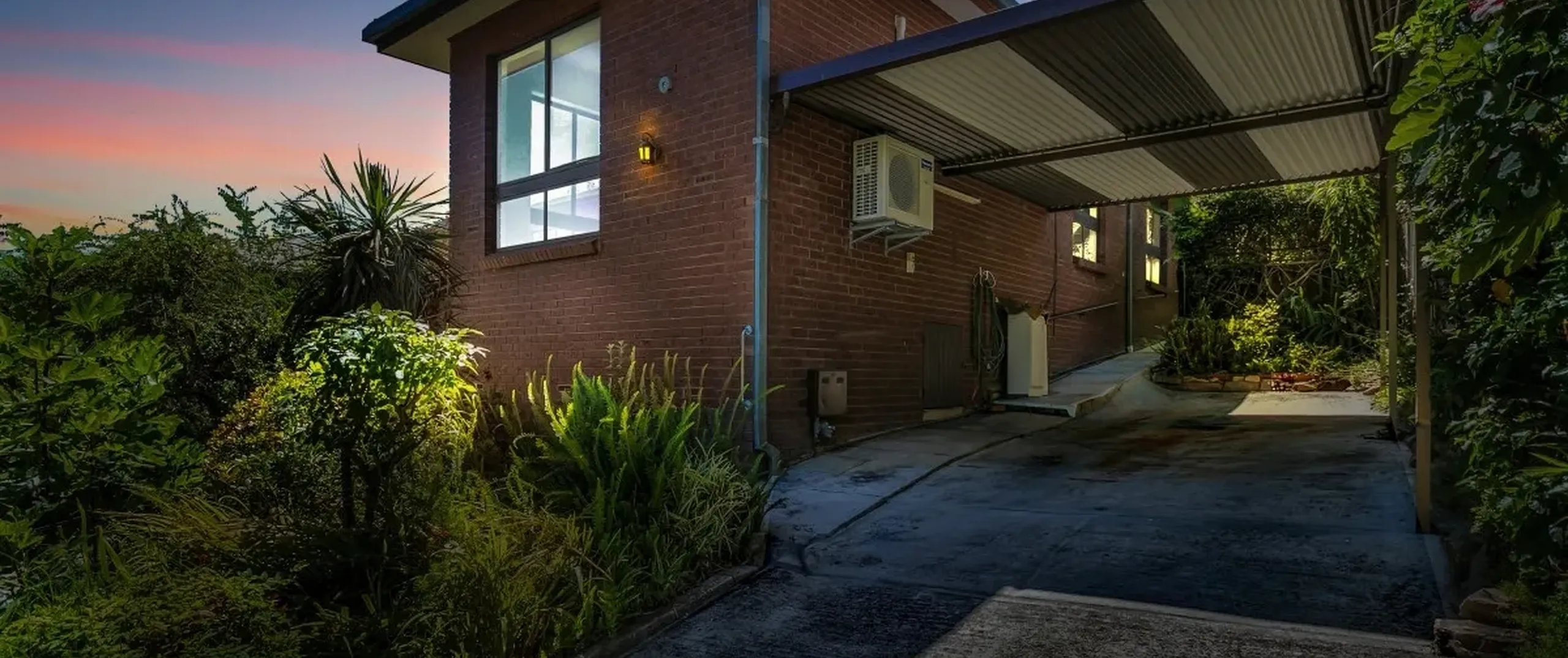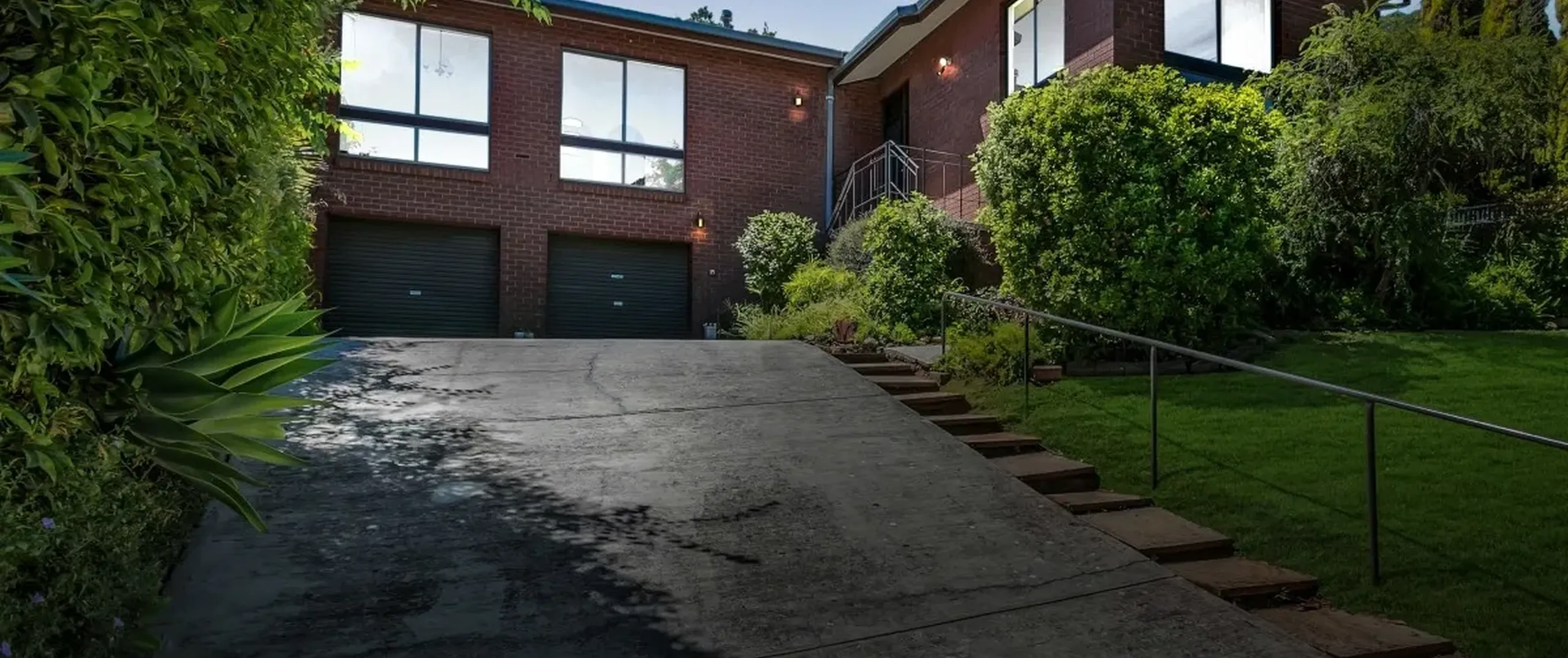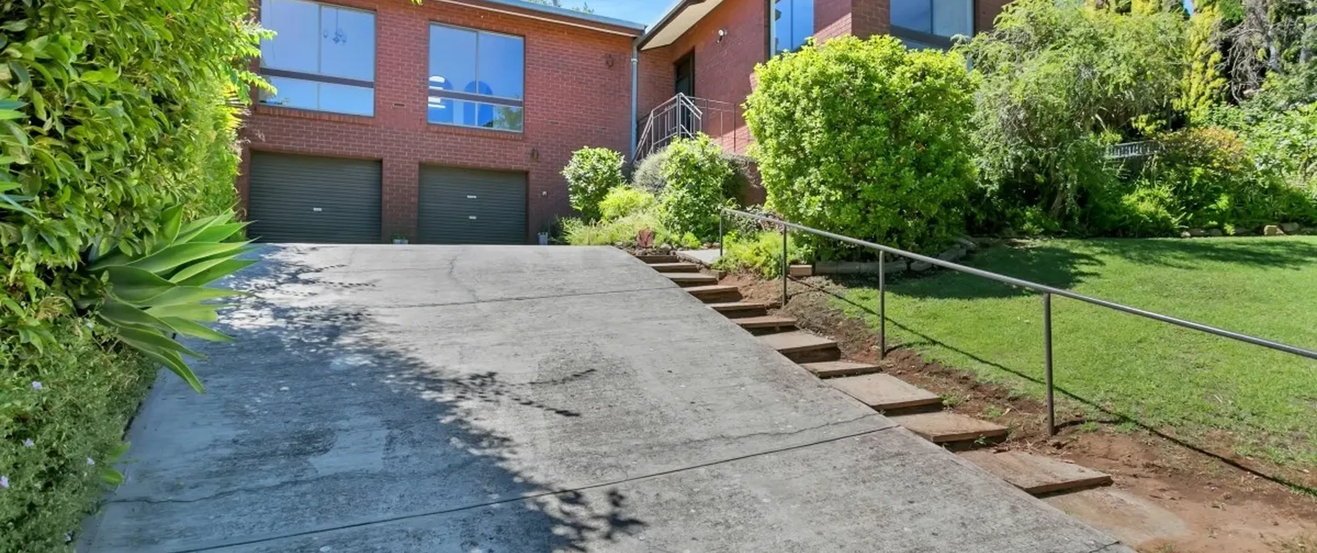 - Dual driveways leading to double garage with roller doors and oversize carport