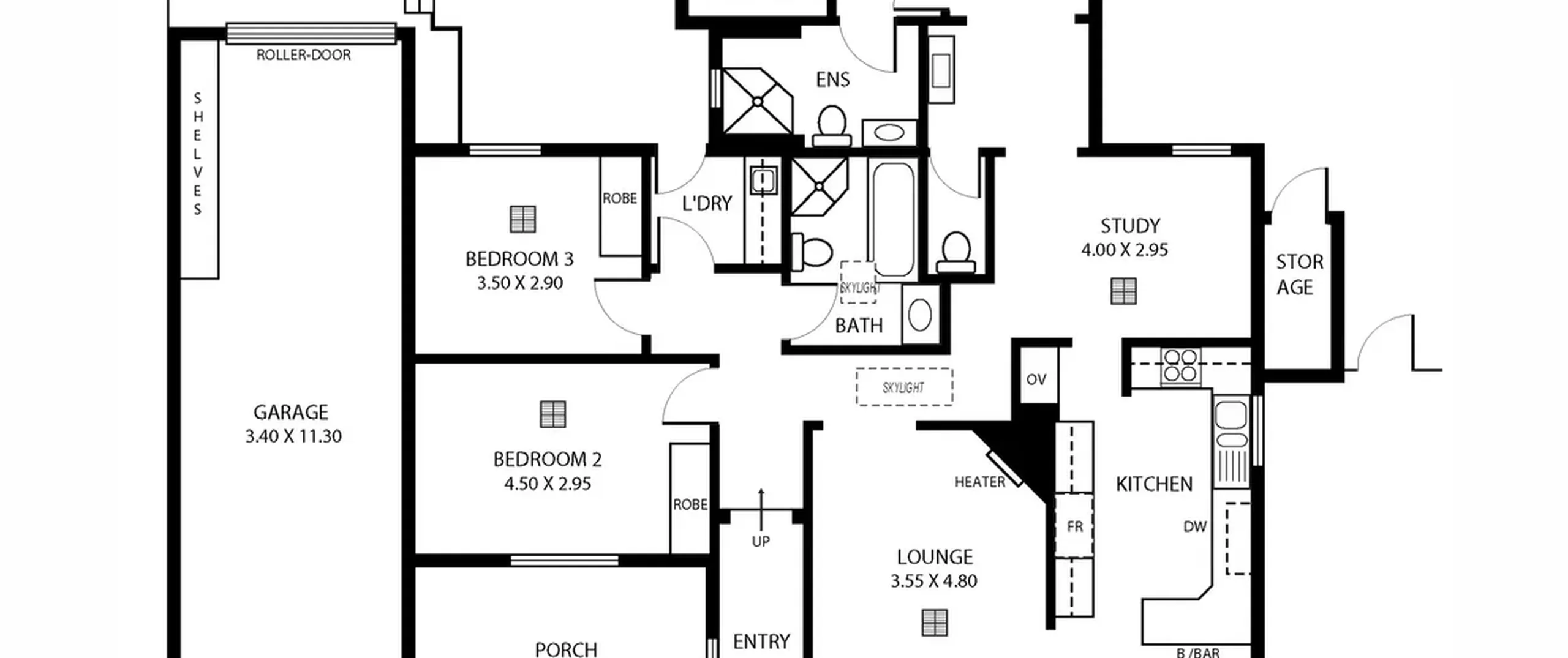 - Double length garage with automatic roller door, built-in shelves and roller door access to rear