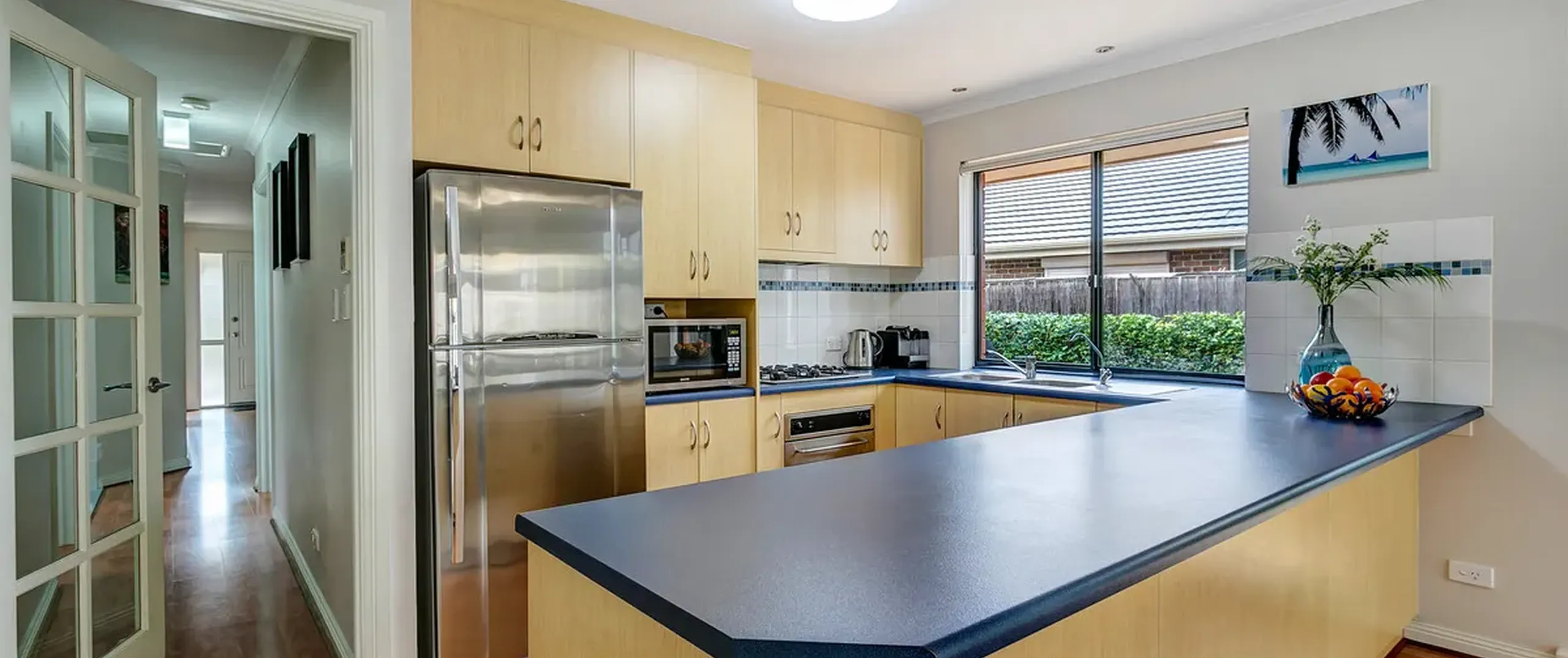 - Practical kitchen with breakfast bar, stainless steel appliances and ample cupboard and bench space
