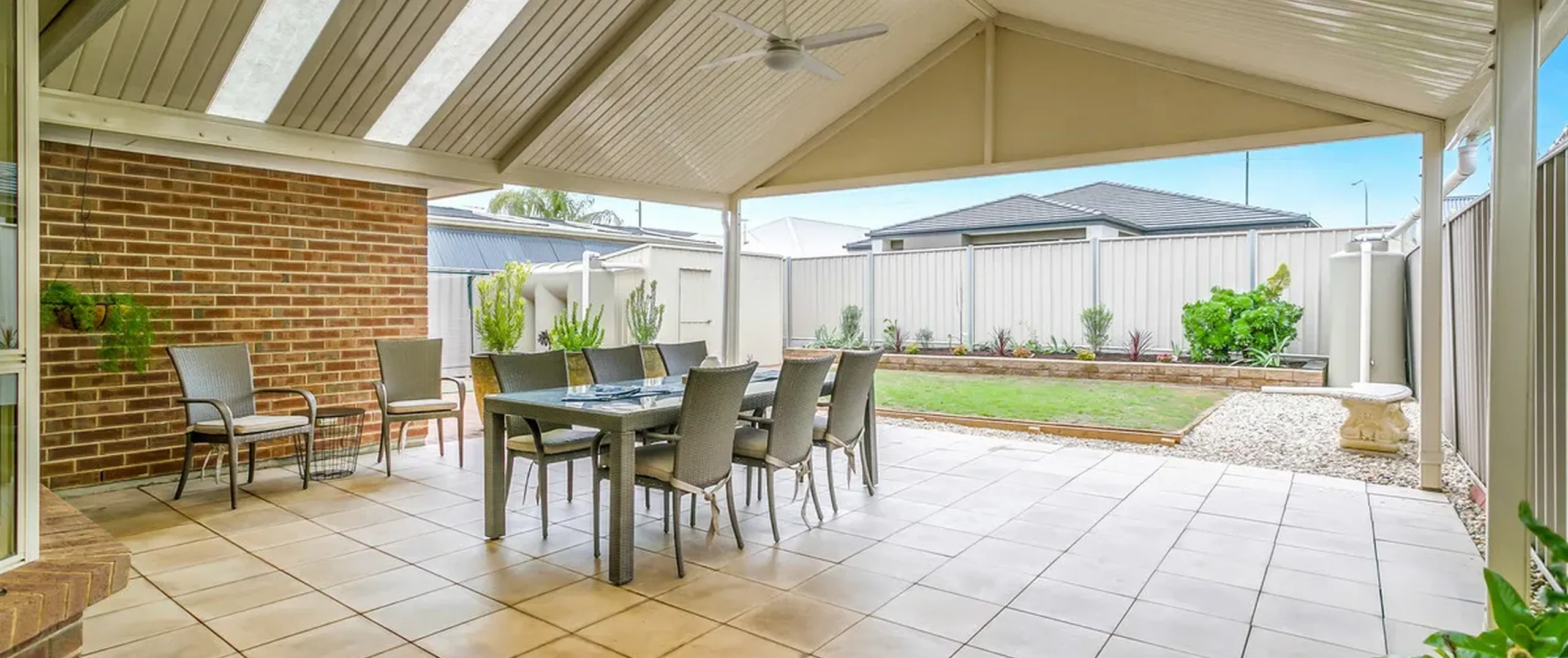 - Huge verandah entertaining area with ceiling fan and pitched roof