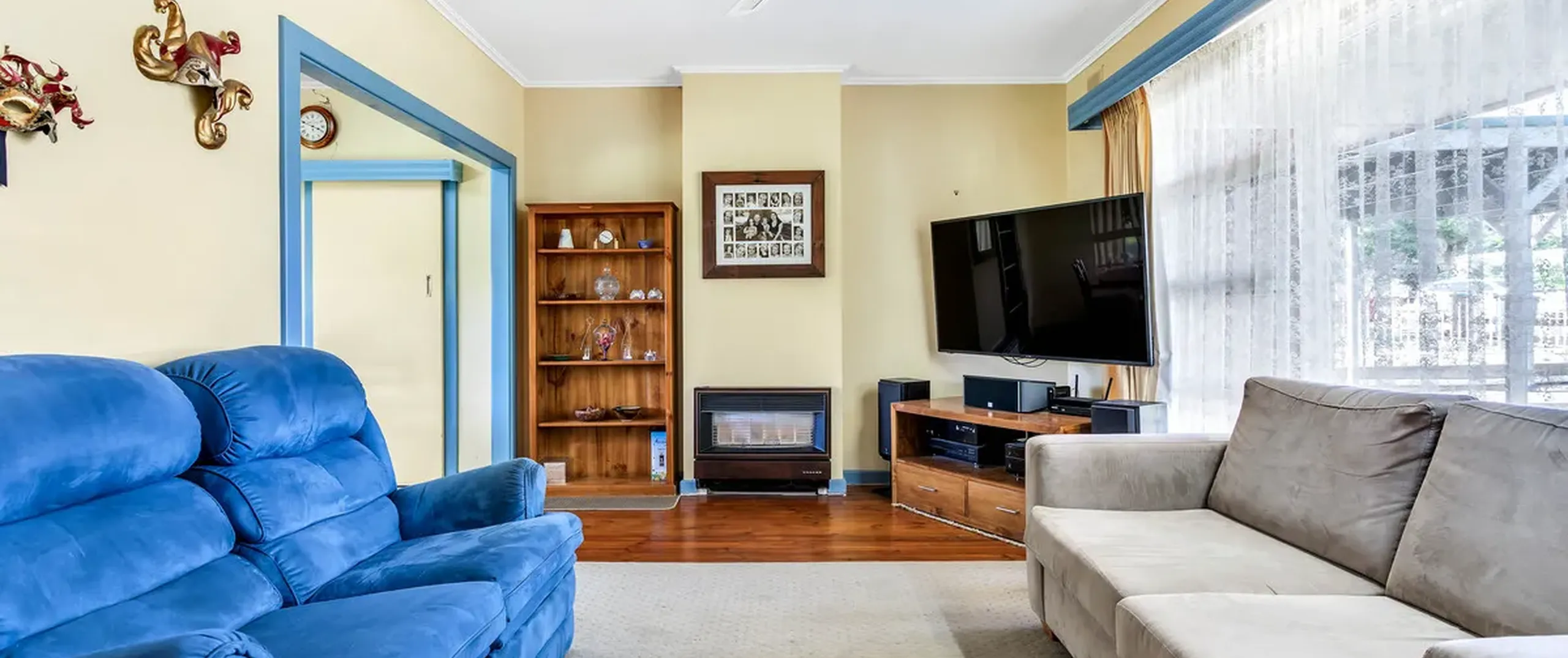 - Spacious lounge with gas heater and ceiling fan