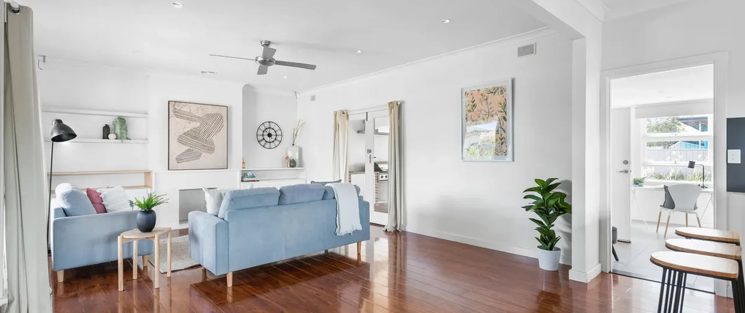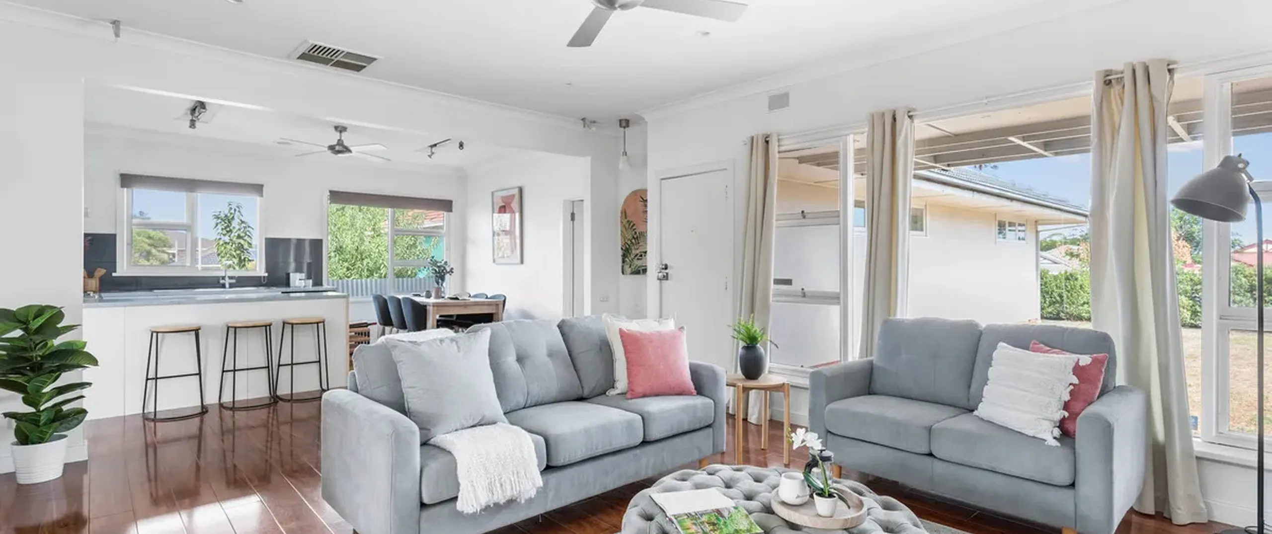 - Spacious open plan living, dining and kitchen complete with ceiling fans and French doors opening to the alfresco