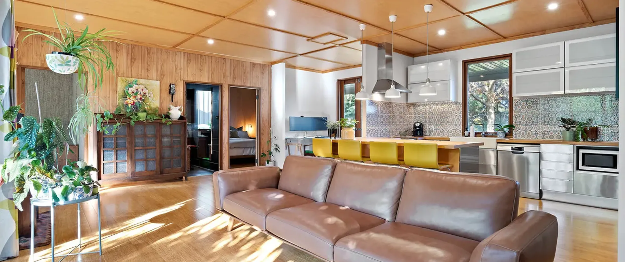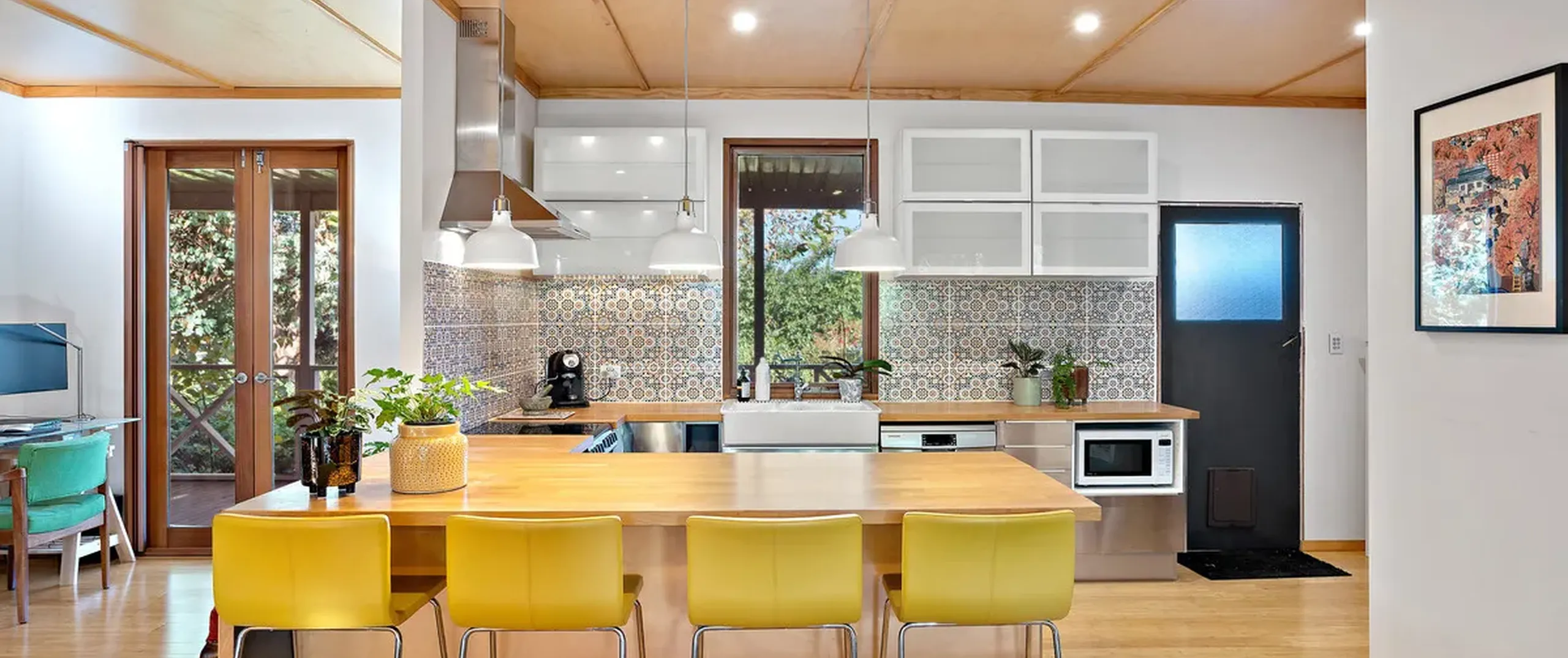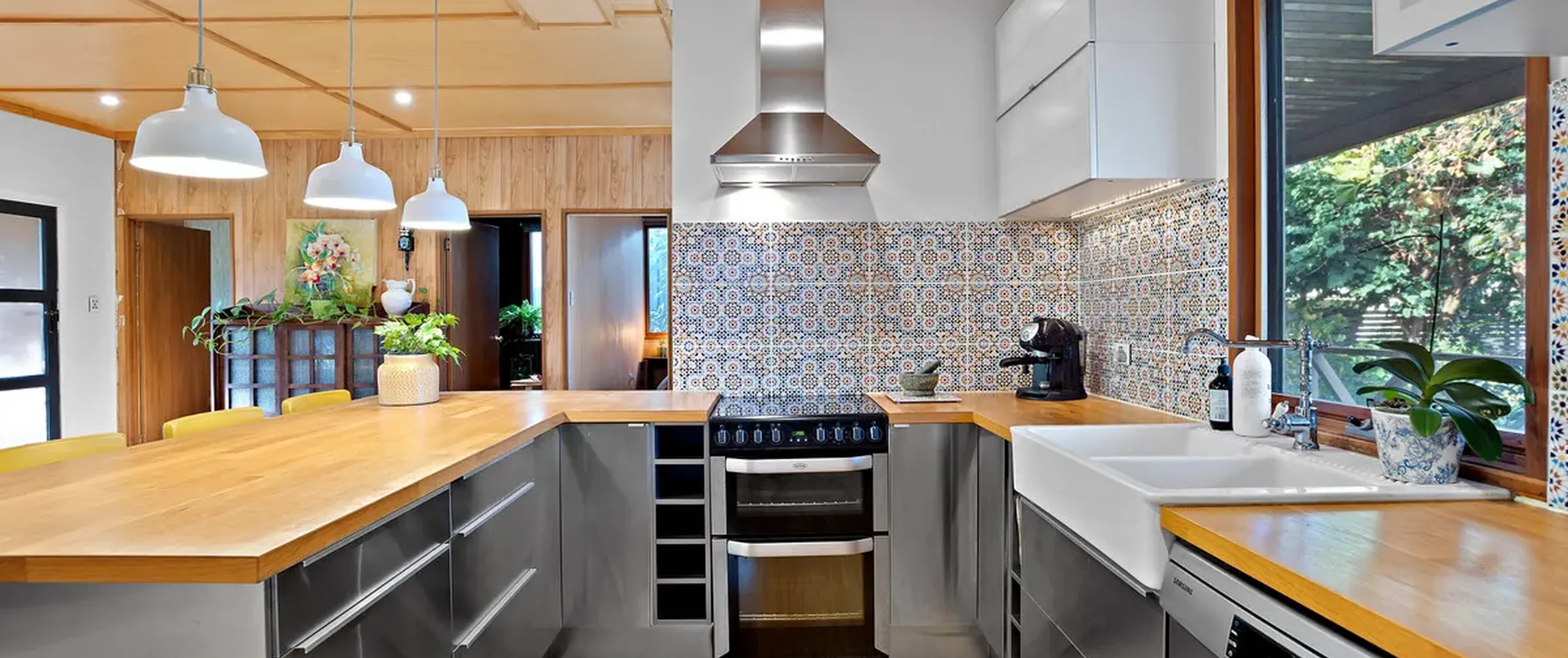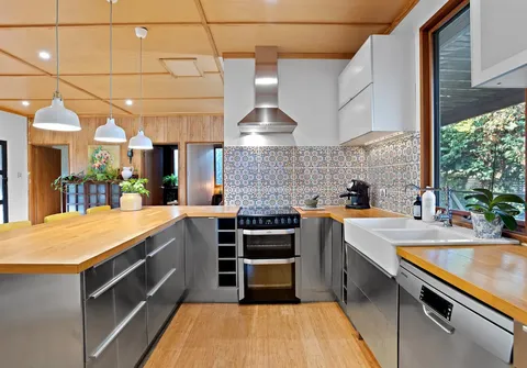 - Stylish and unique kitchen with stainless steel appliances, ample cupboards, dishwasher, induction cooktop, retro feature splash back and breakfast bar; updated in approximately 2012
