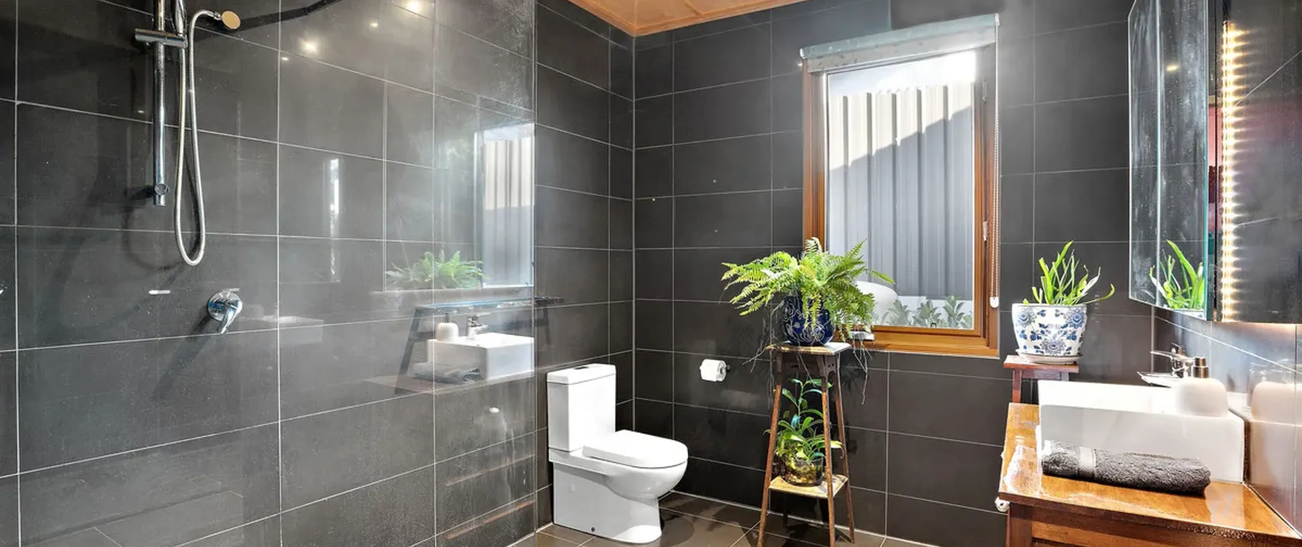 - Large modern bathroom with floor to ceiling tiles; renovated in approximately 2012
