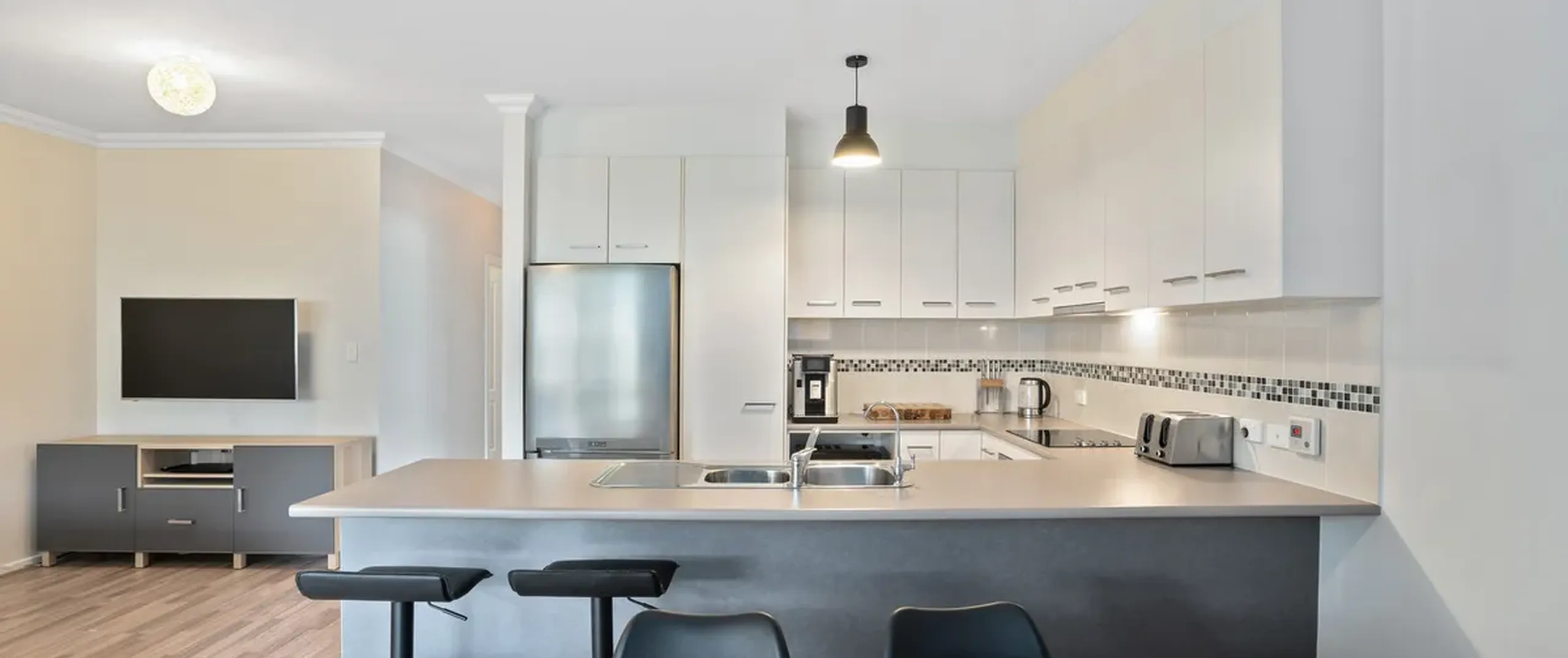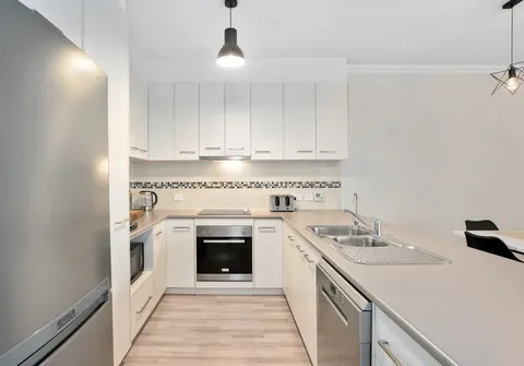 - Well equipped kitchen with ample cupboard space, sweeping benchtops, breakfast bar, quality stainless steel appliances including dishwasher and complete with matte black feature pendants