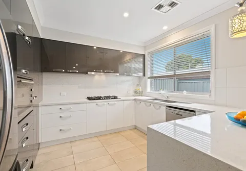 - Chic kitchen with stylish tiled splash back, stainless steel dishwasher and oven, 900mm gas cooktop, large pantry, abundance of cupboard space and stone benchtops