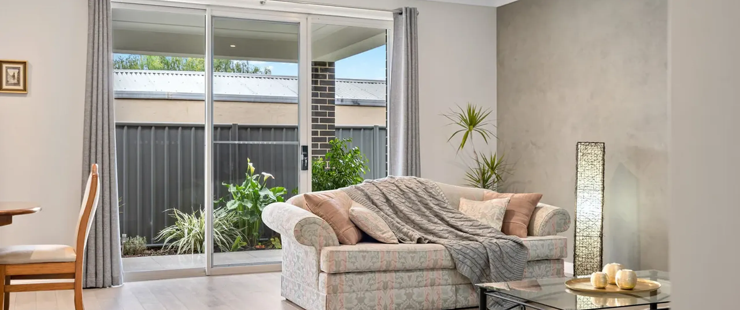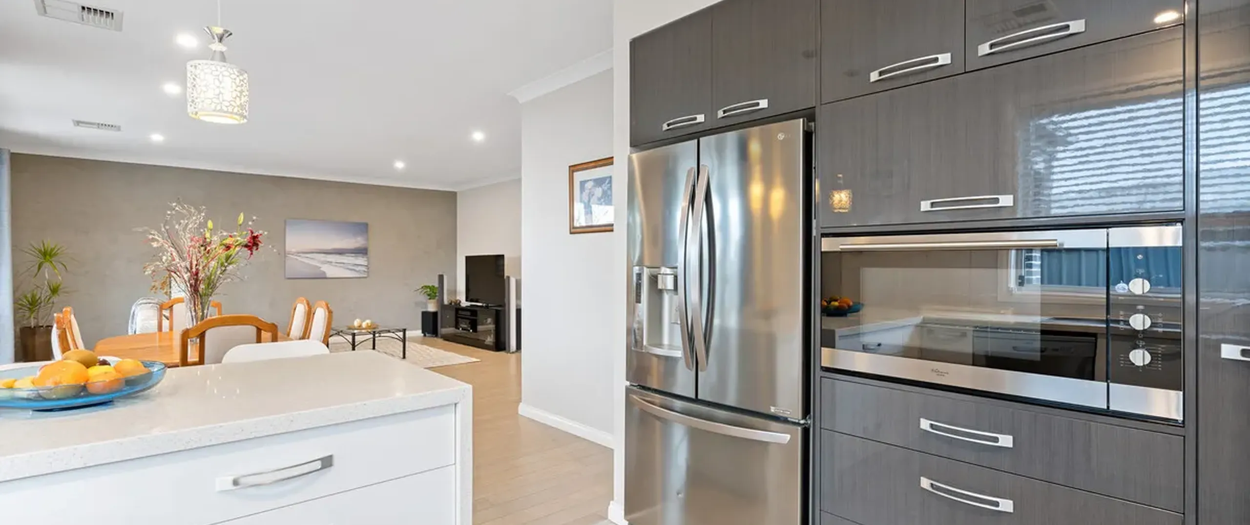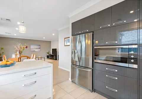 - Open-plan kitchen, living and dining room with glass sliding doors leading through to the alfresco