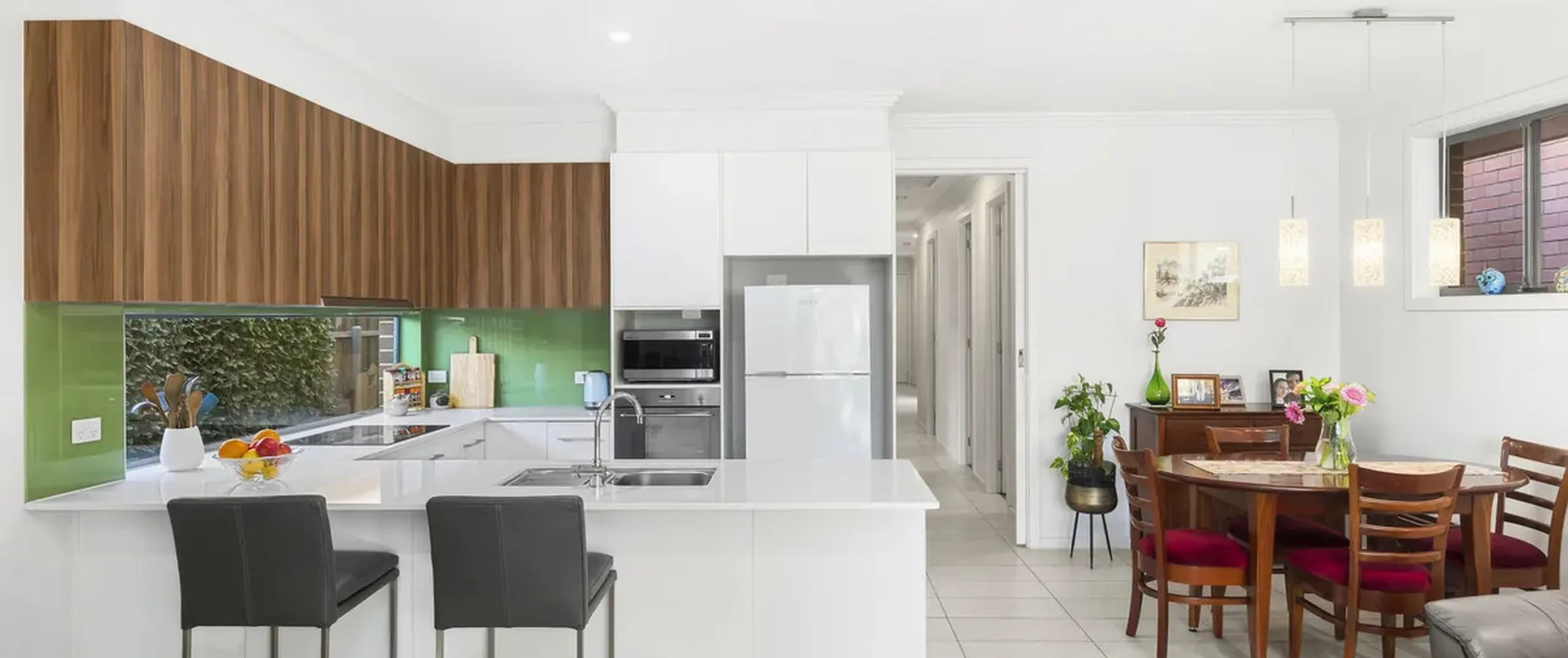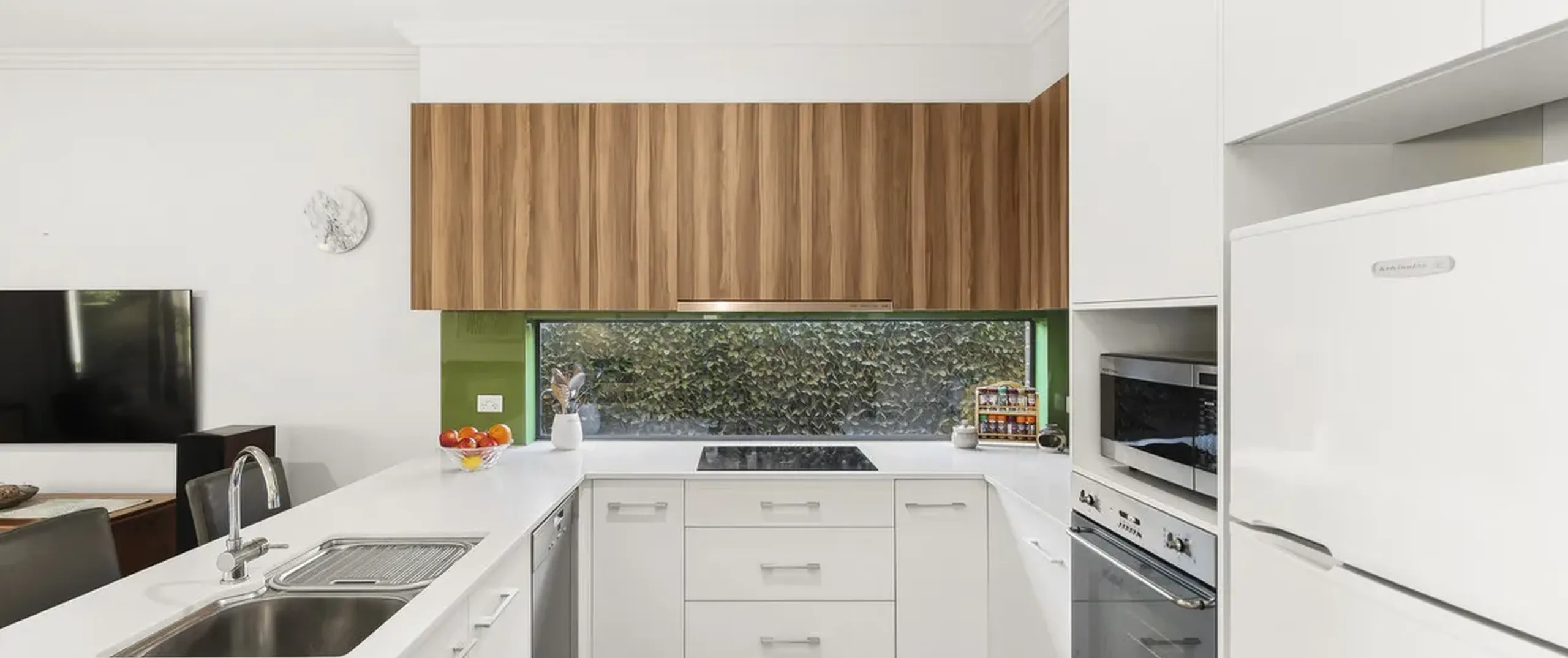 - Contemporary, white kitchen featuring window splash back, stainless steel appliances including oven and dishwasher and breakfast bar