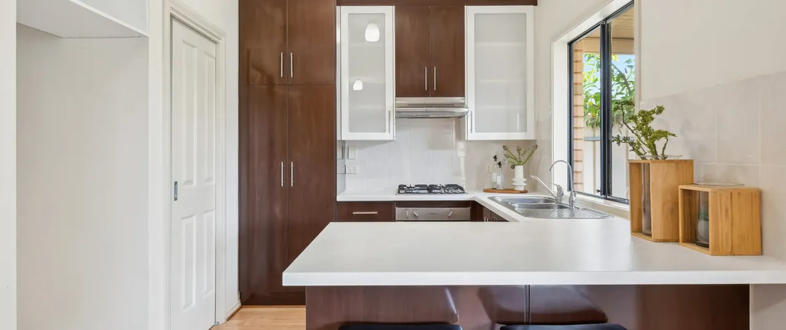 - Modern kitchen with gas cooktop, dishwasher and breakfast bar