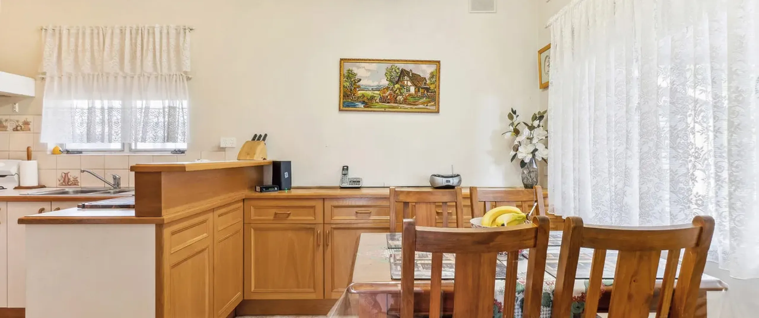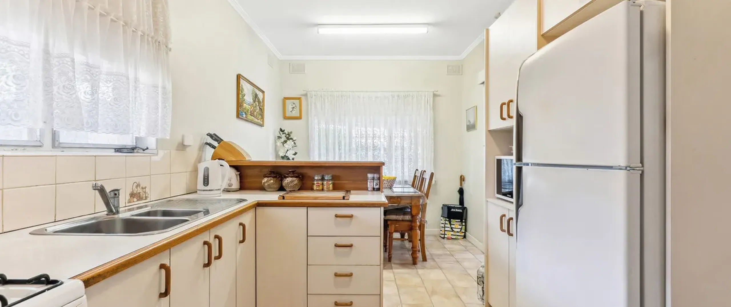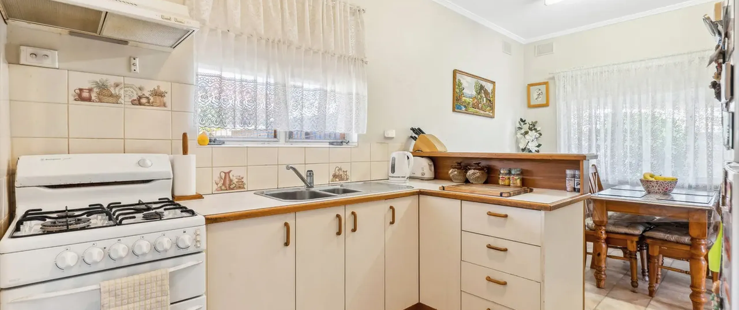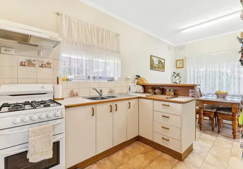 - Neat and tidy, kitchen with ample cupboard space and freestanding oven with gas cooktop overlooking meals area with built in cabinetry