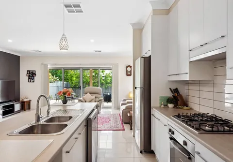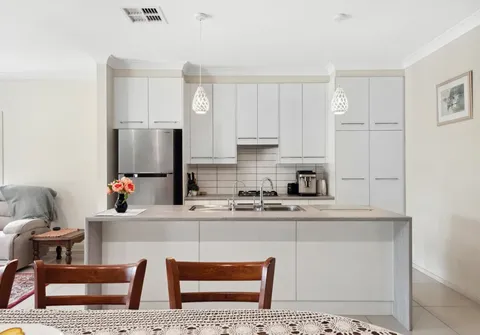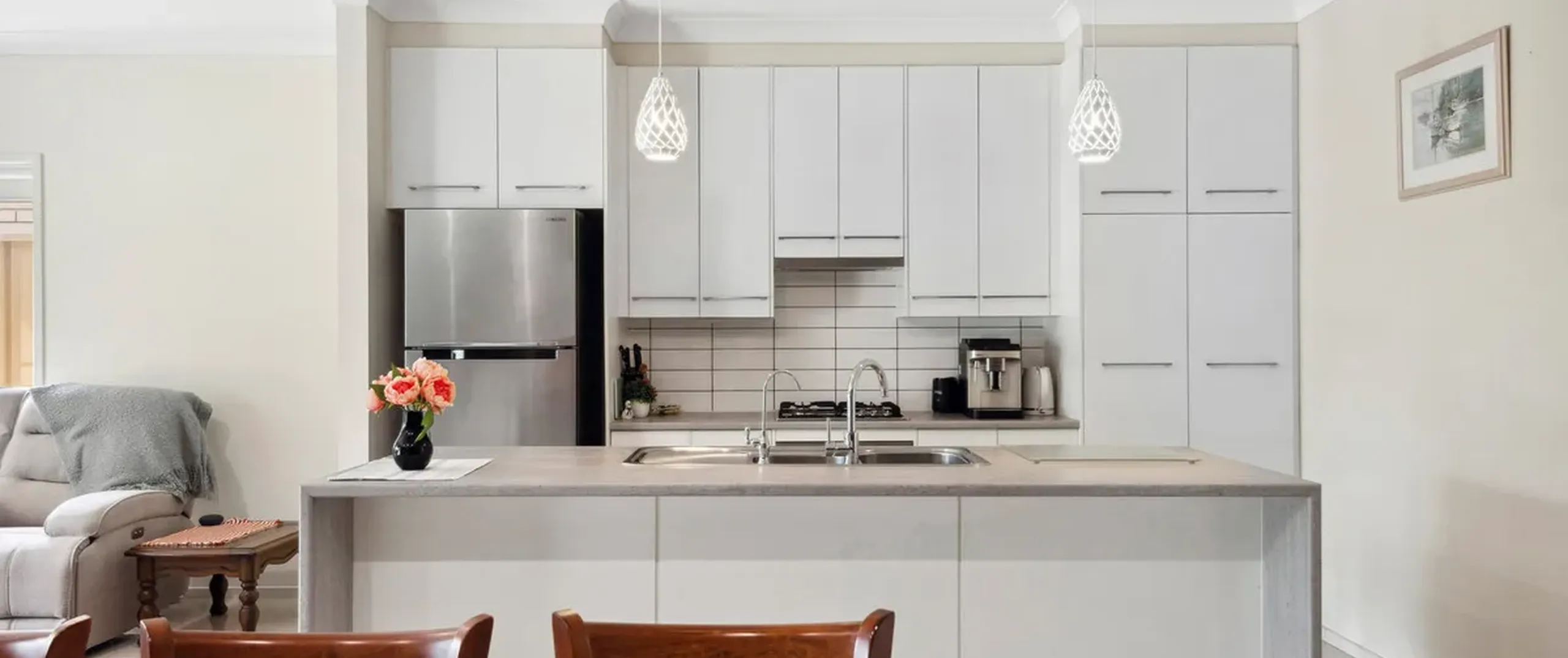 - The modern kitchen, complete with a built-in pantry, island bench, stainless steel gas cooktop, sleek benchtops, and ample cupboard space with breakfast bar will be the true heart of the home