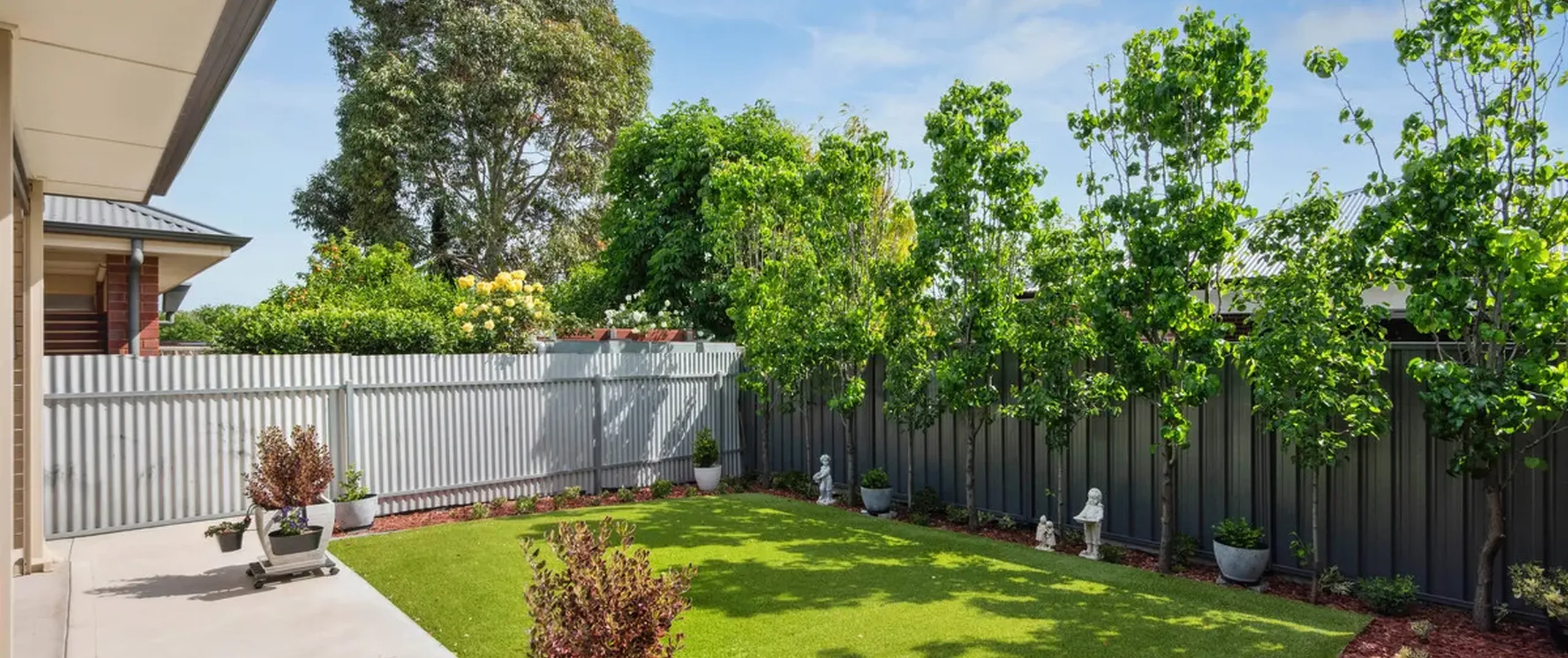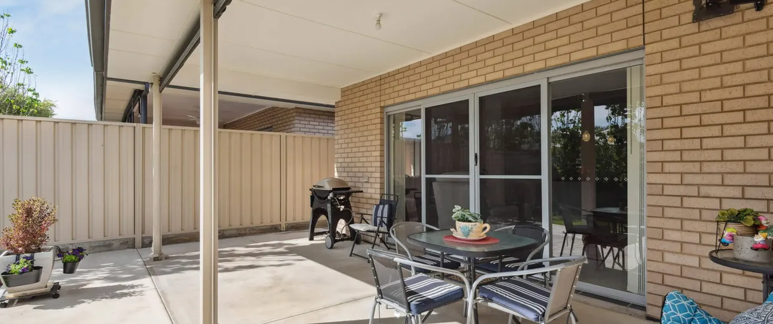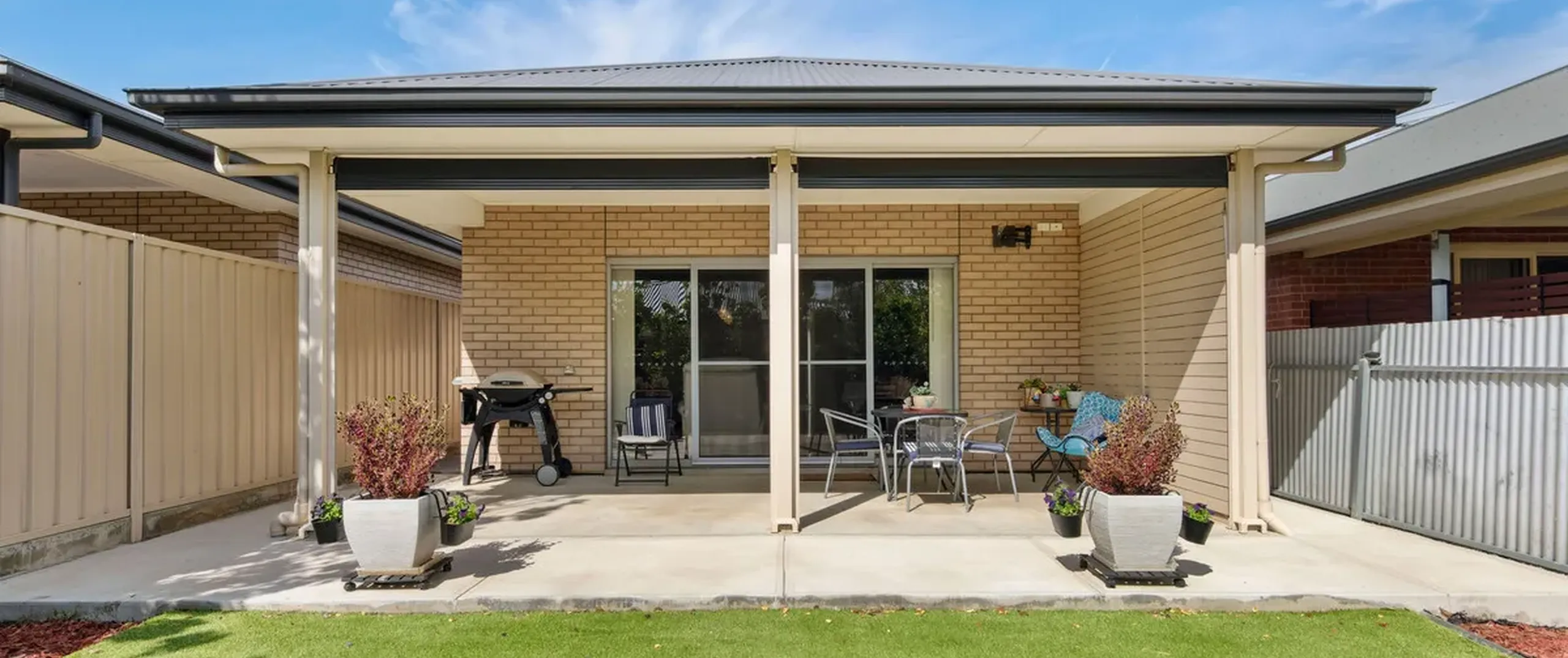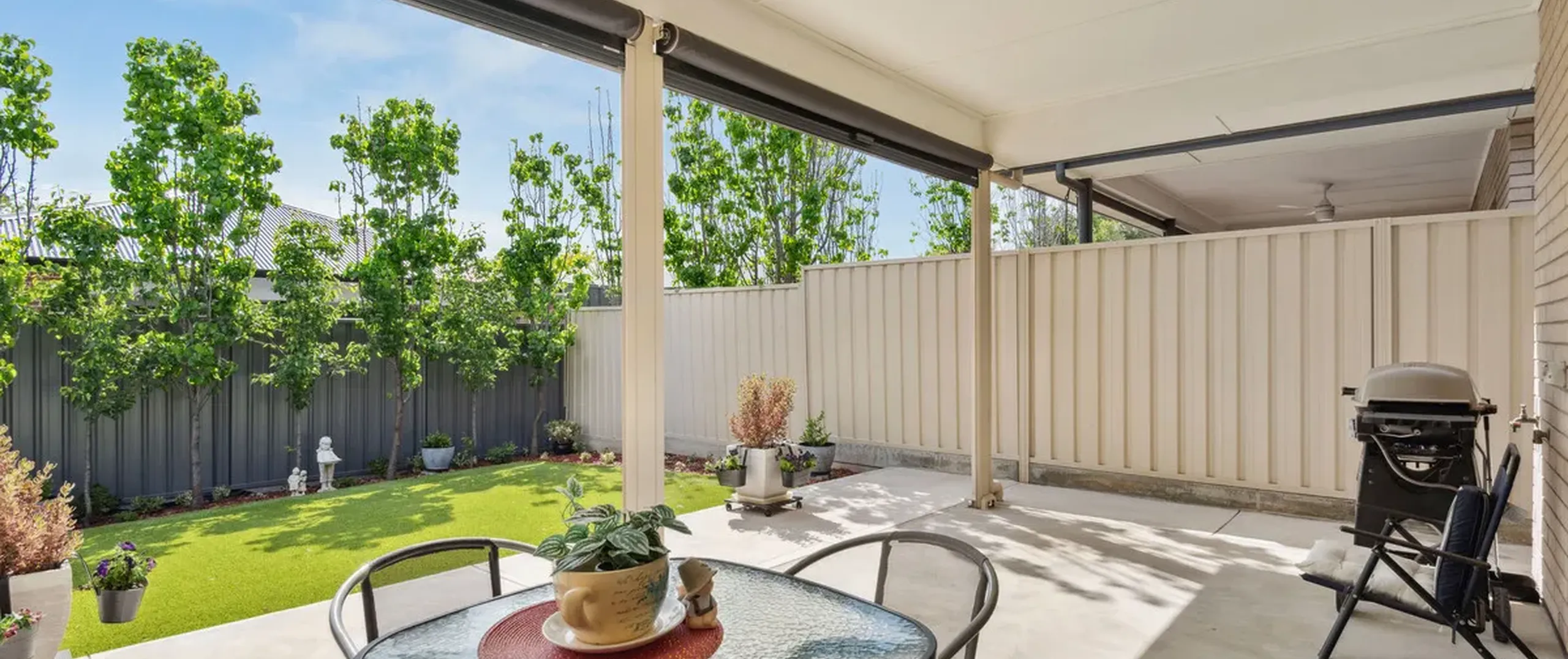 - The outdoor entertaining area, complete with roller blinds, offers a view of a low-maintenance gardens complete with a artificial lawn