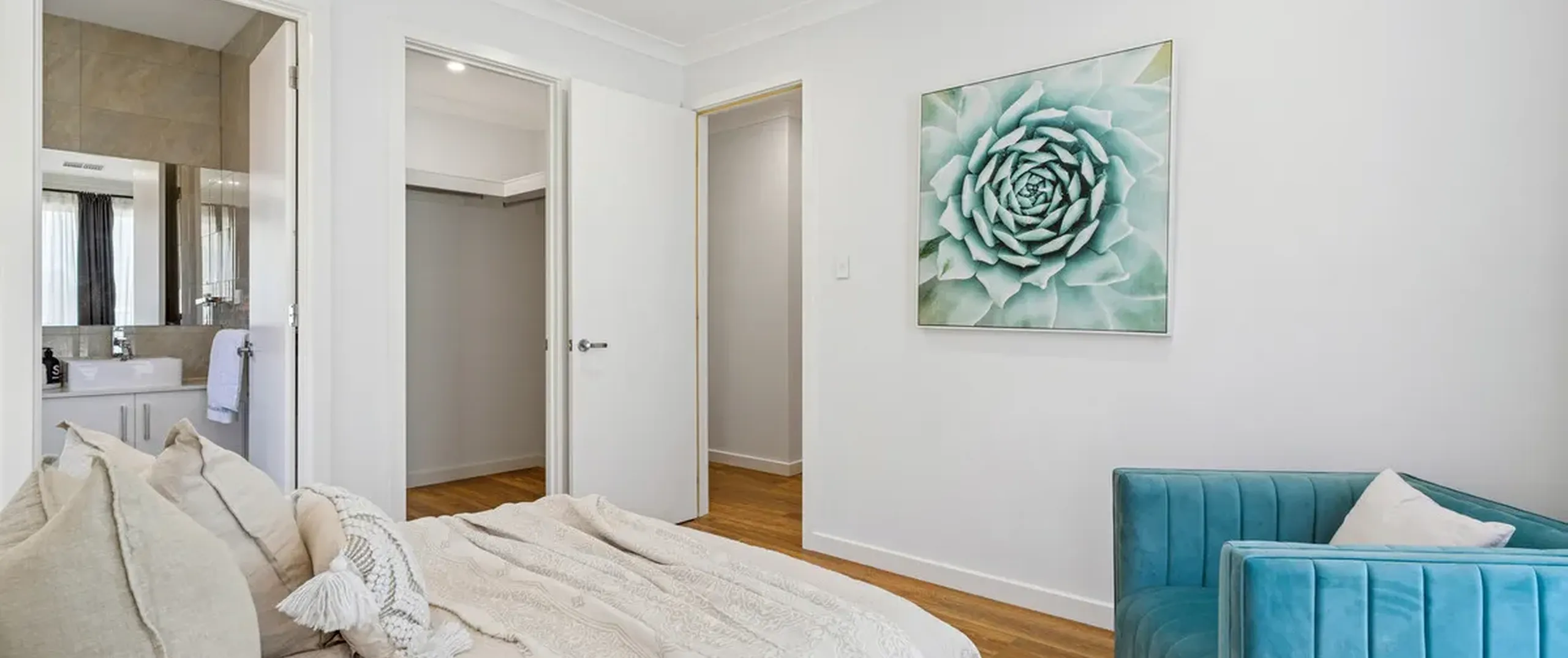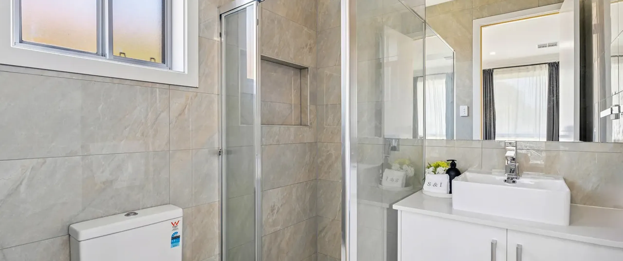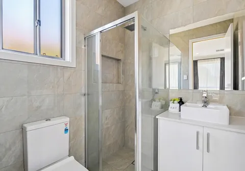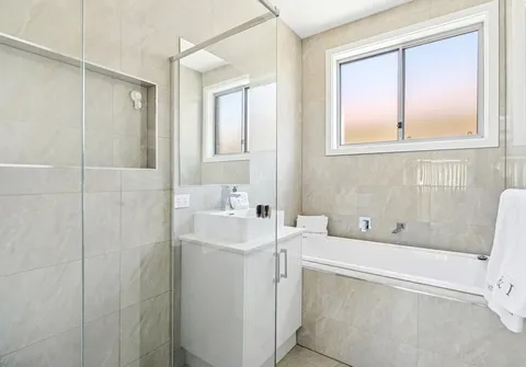 - Master bedroom with walk-in robe and modern ensuite featuring floor to ceiling tiles