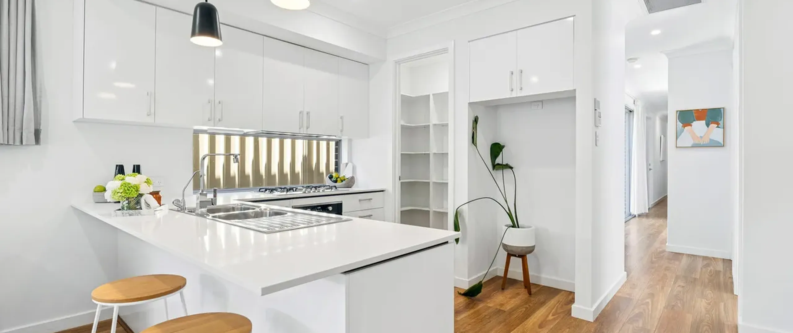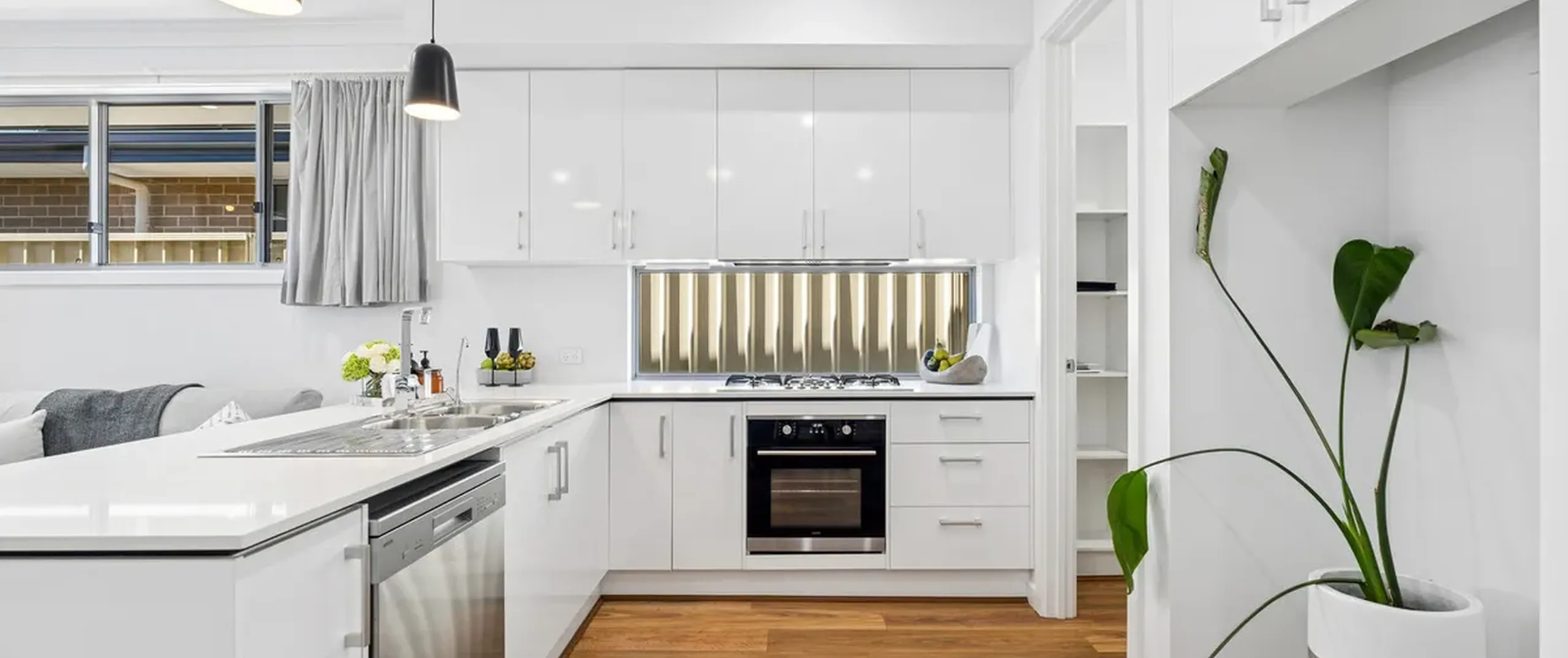 - Chic, white kitchen with dishwasher, gas cooktop and walk-in pantry