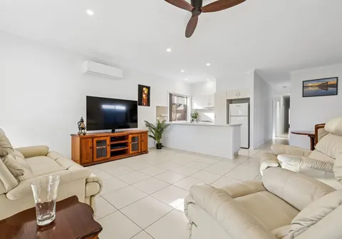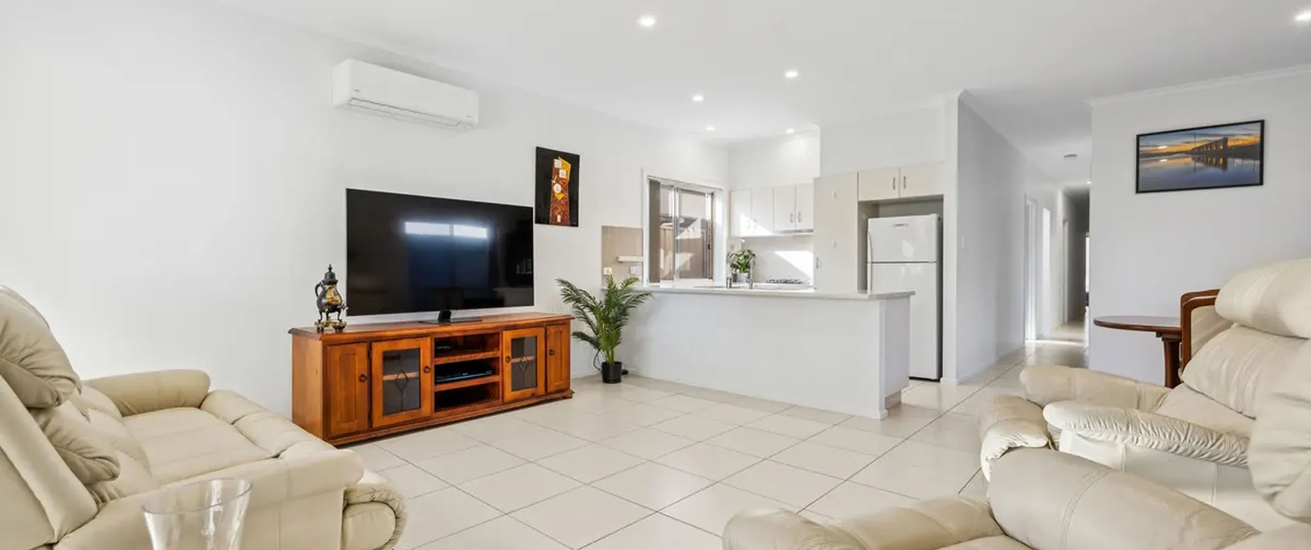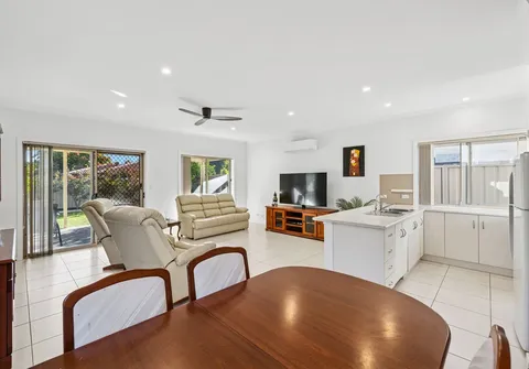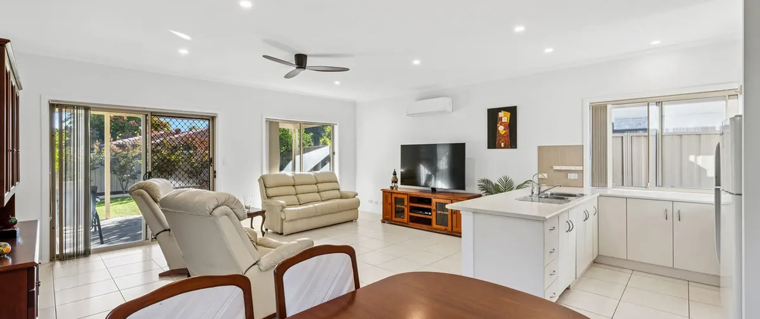- Sunlit, open plan living, dining and kitchen area with split system air conditioner and ceiling fan