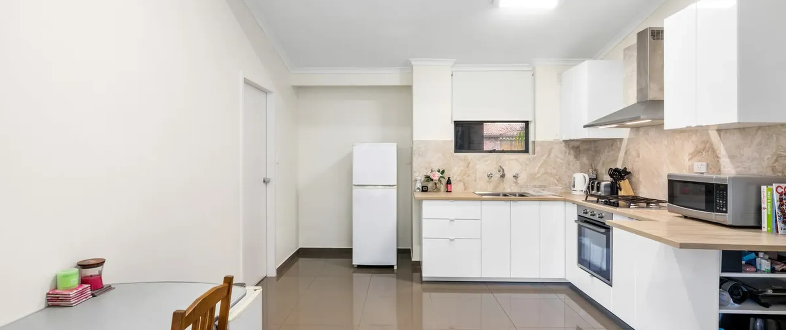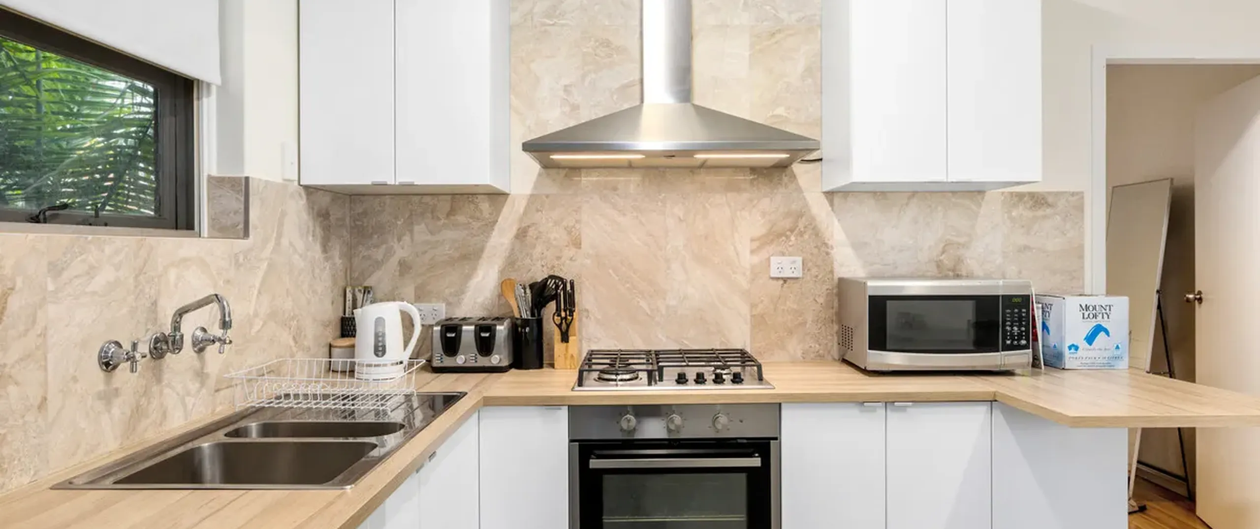 - Fully renovated dine-in kitchen with sky light, ample cupboard space and stainless steel appliances including a gas cooktop