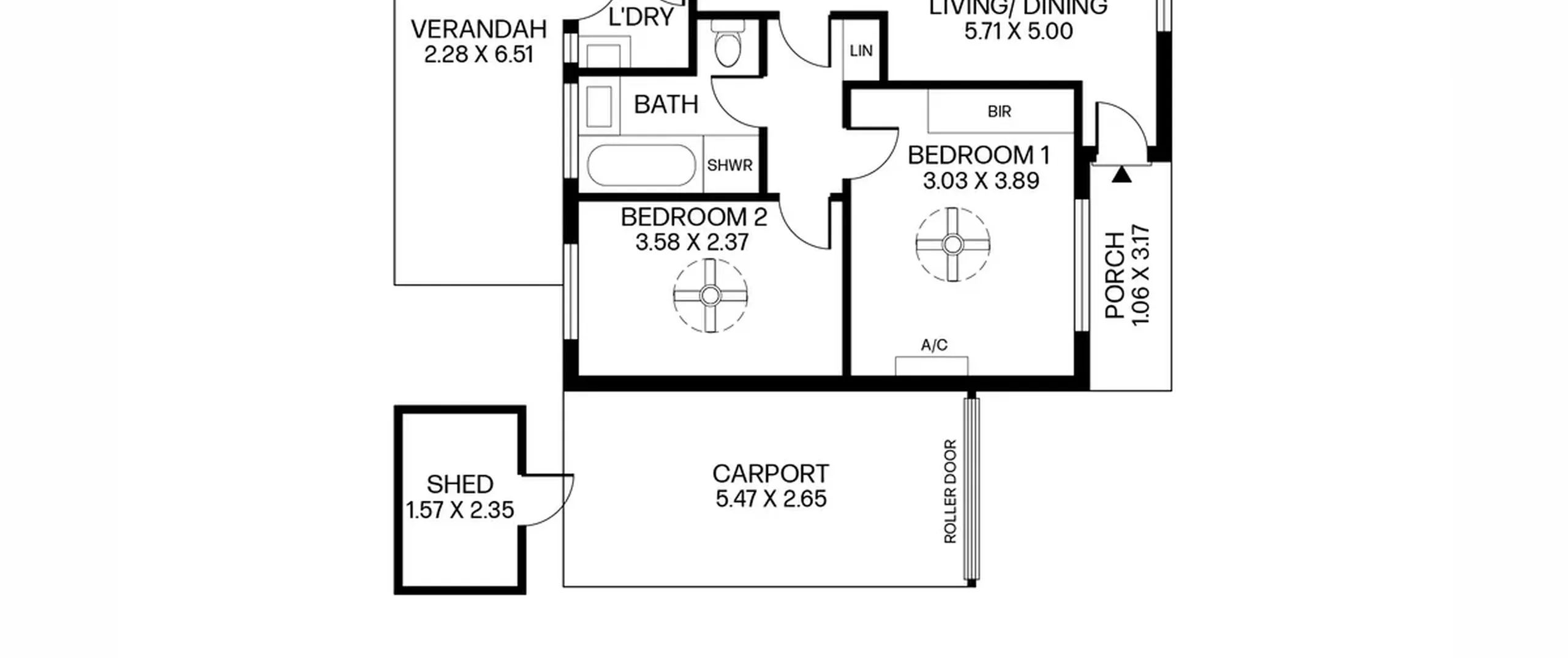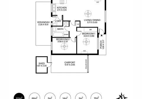 The layout offers two bedrooms and one bathroom as well as a light-filled, open plan living and dining area, with air-conditioning, plus a well-appointed kitchen. Here, gas cooking and ample storage await while a central main bathroom and practical laundry complete the floorplan.