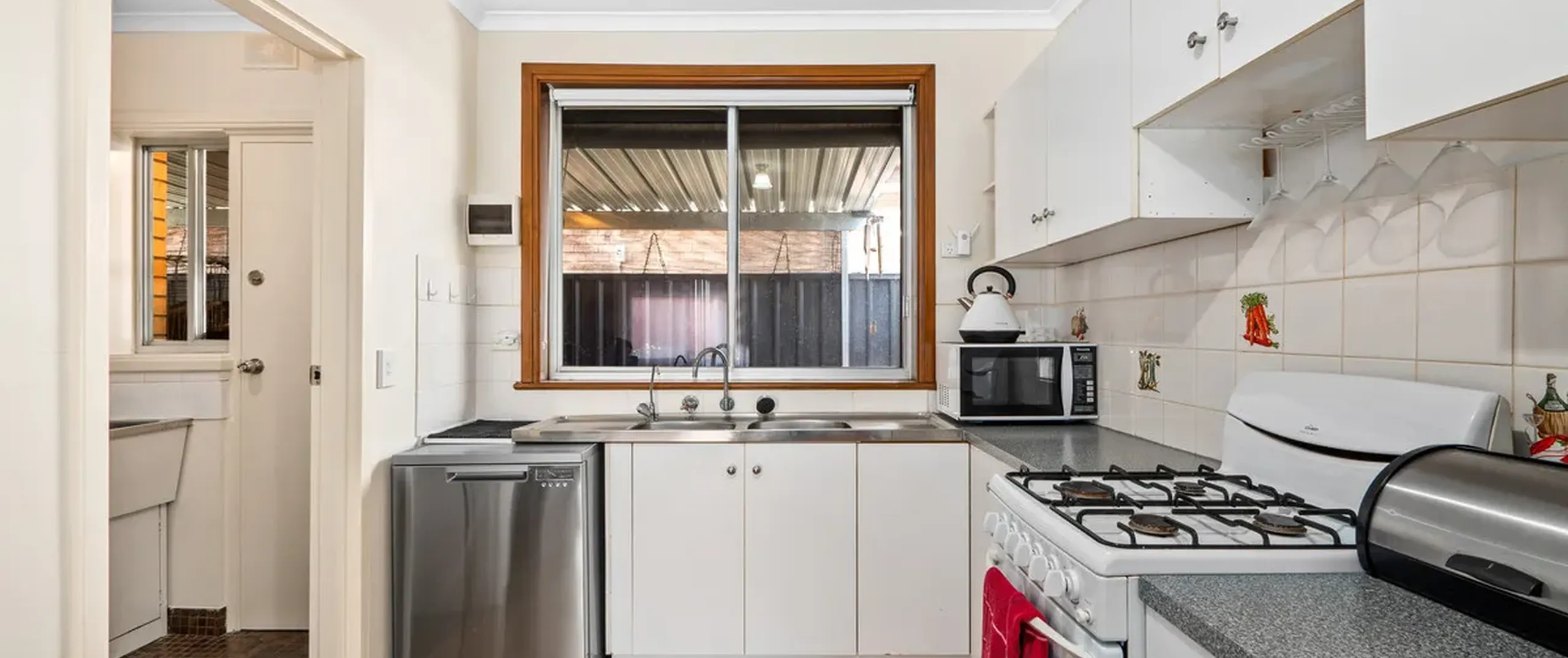 - Bright and practical kitchen with ample cupboard space and gas cooking