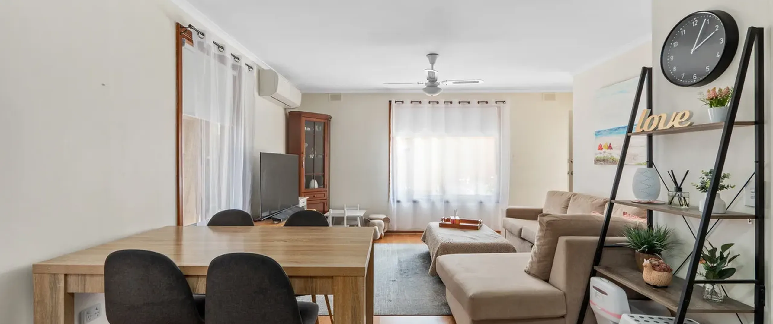 - Light filled living and dining area with split system air conditioner and ceiling fan for year-round comfort
