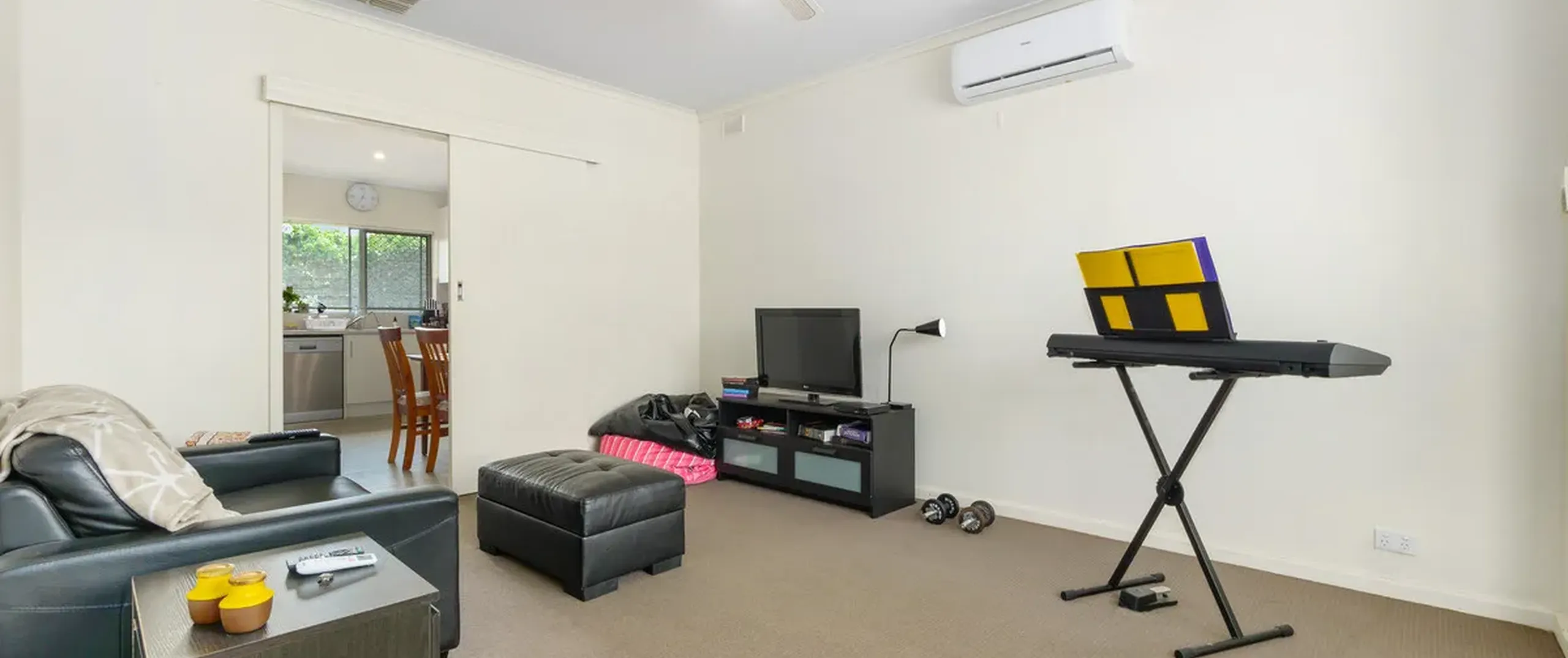 - Light filled living upon entry with ceiling fan and split system air conditioner for year-round comfort