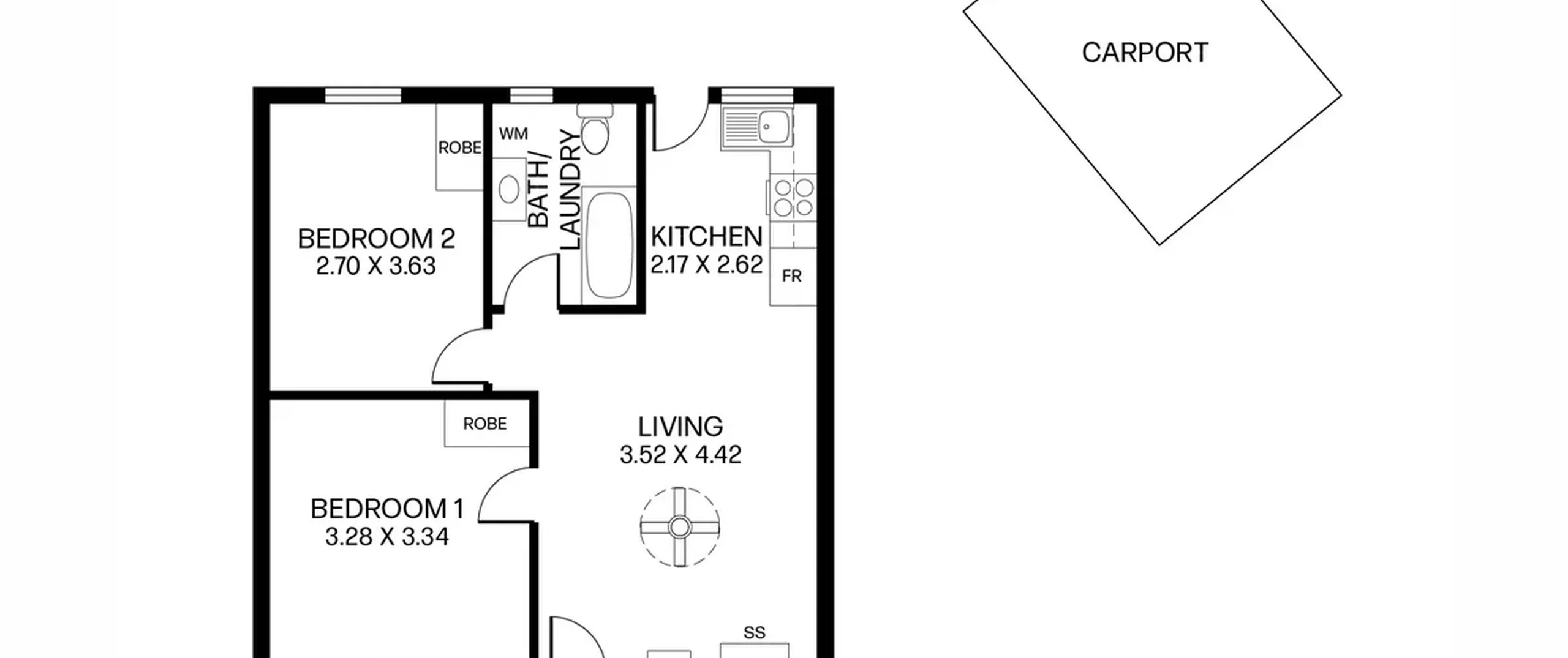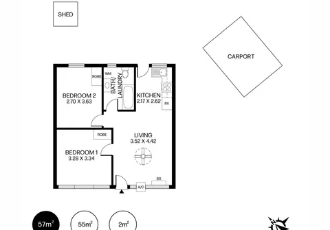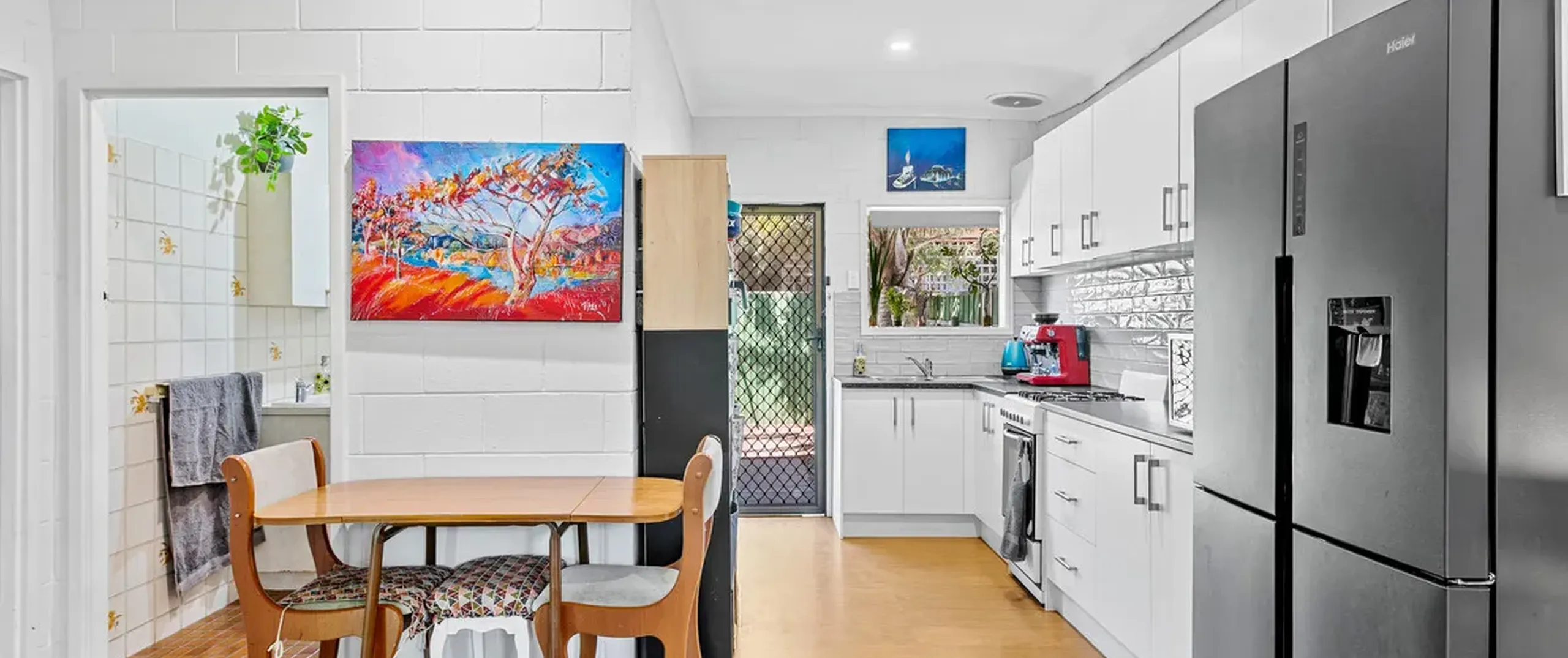 The layout offers two bedrooms and one bathroom as well as a light-filled living/meals area, with air-conditioning, plus a well-appointed kitchen. Here, gas cooking and ample storage await while a central main bathroom completes the floorplan.