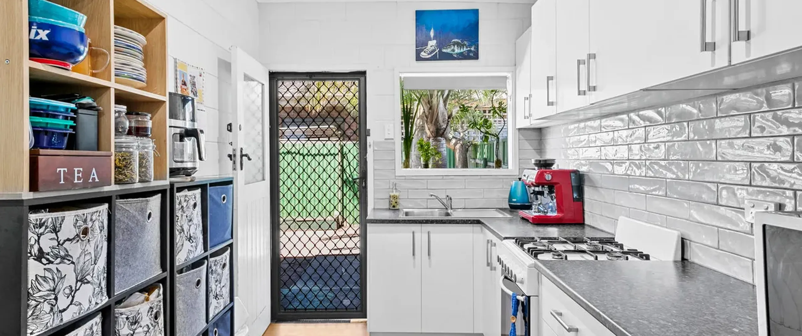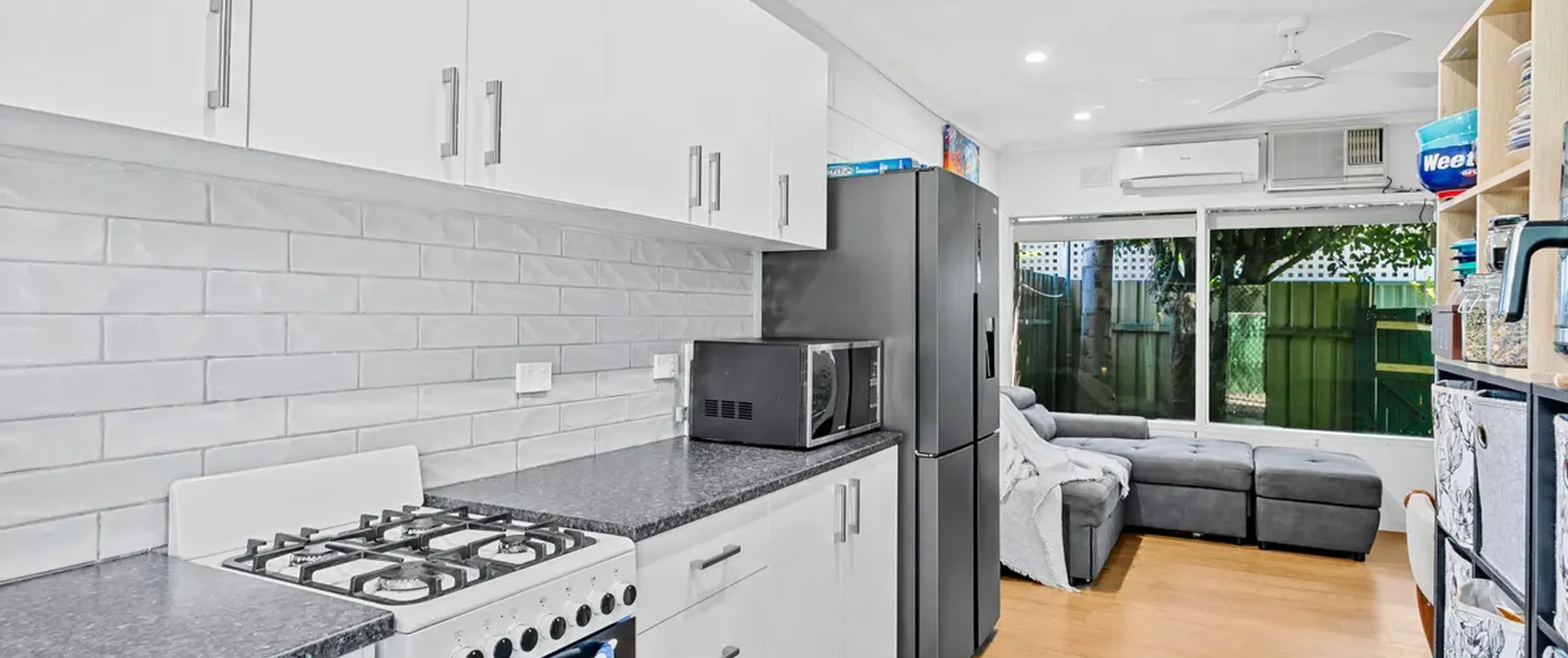 - Modern white kitchen with ample cupboard space, standalone gas cooktop and oven, complimented by feature subway tile splashback