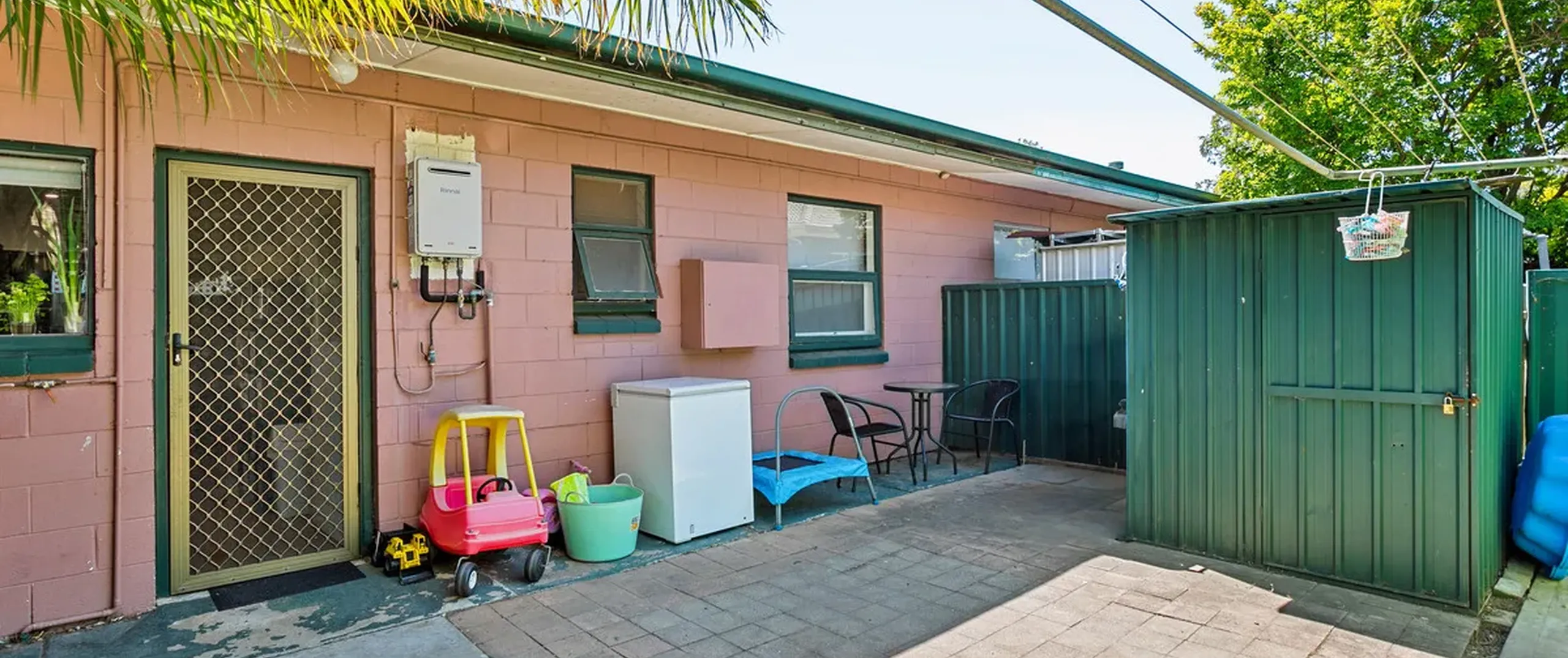 - Low-maintenance paved backyard with garden shed