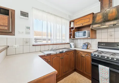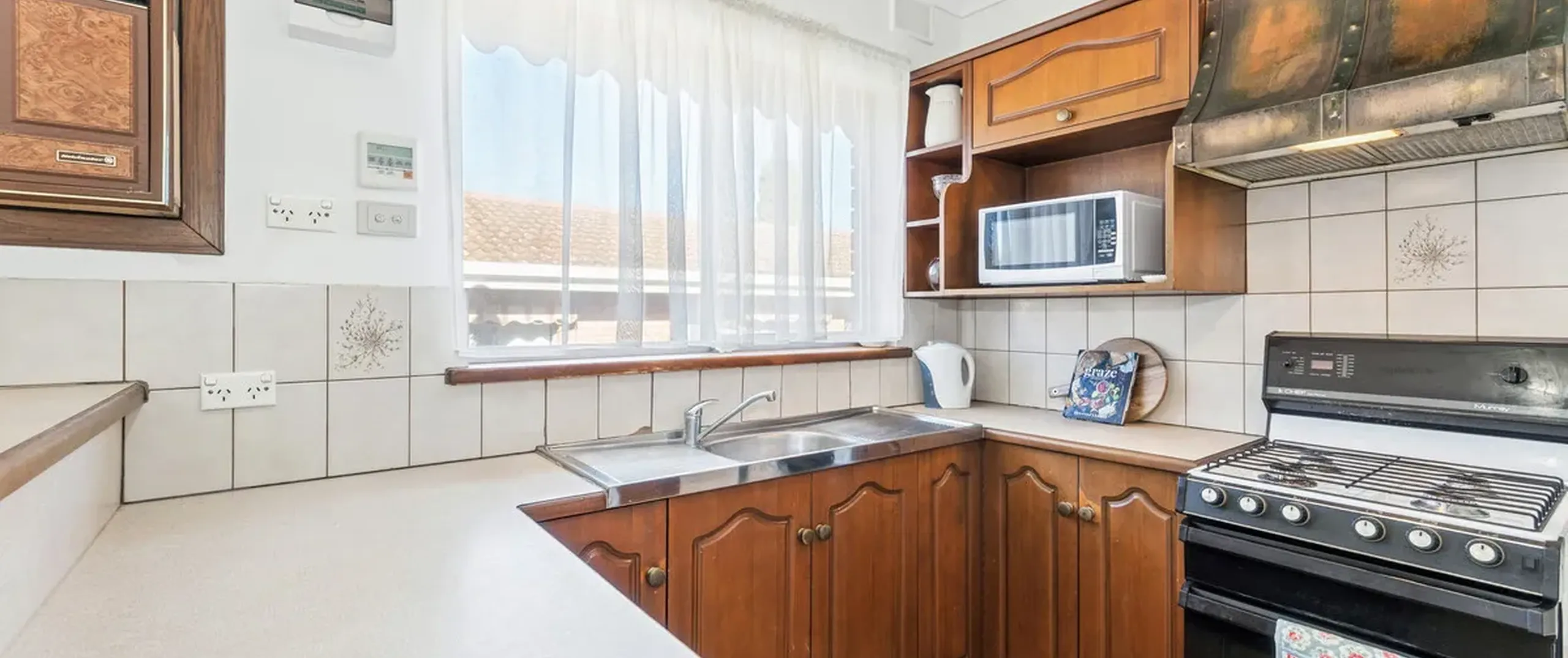 - Well-maintained kitchen with gas cook-top, stainless steel sink and ample storage
