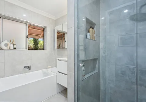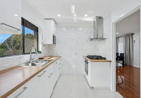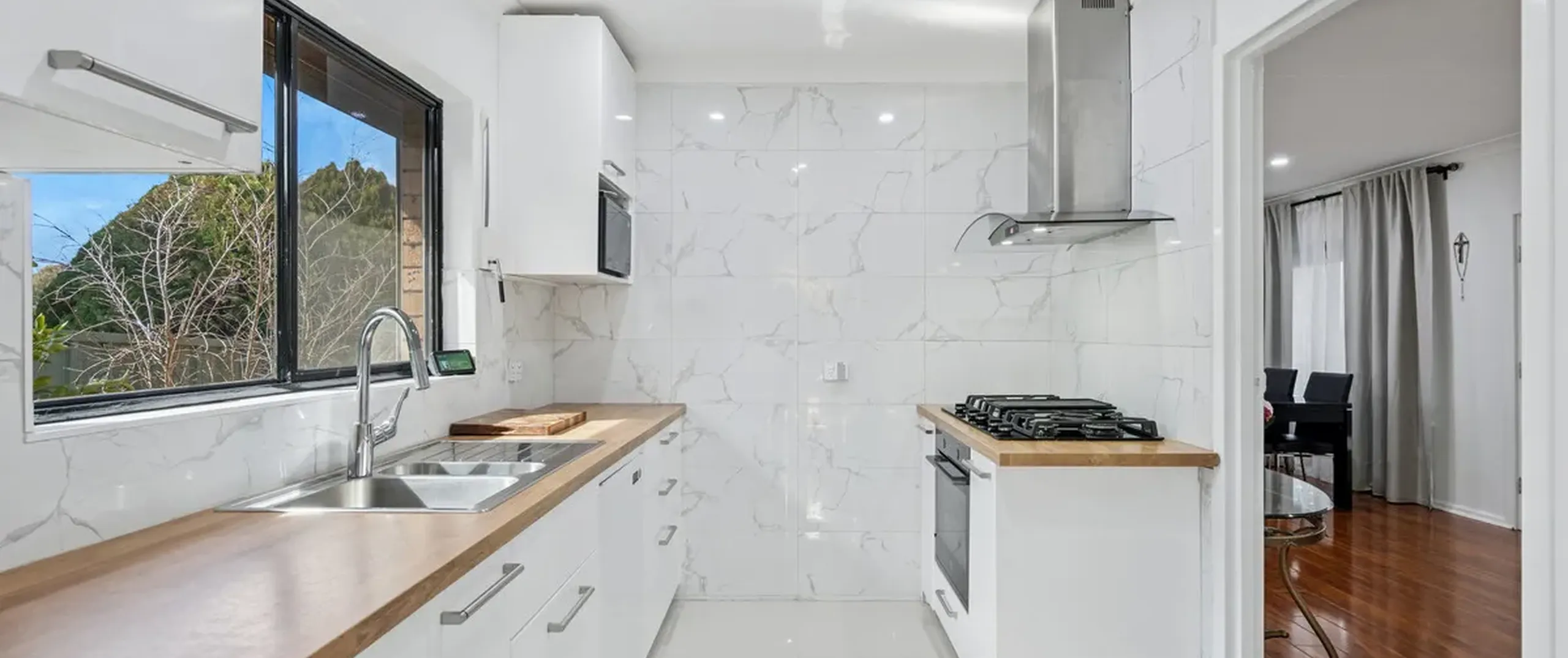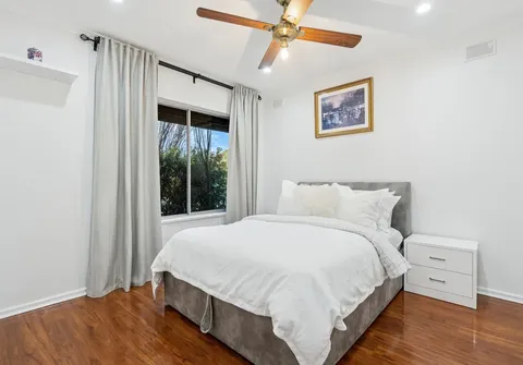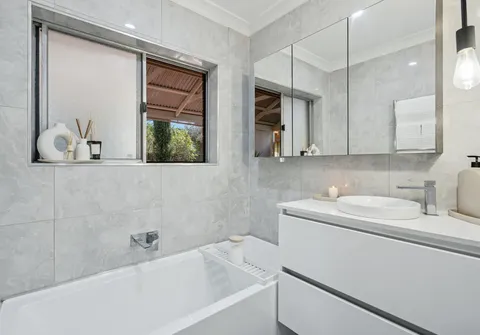 Inside, the home welcomes you with light-filled living and dining areas, timber floors underfoot, and soft finishes of sheers and block-out blinds. The contemporary kitchen is as functional as it is stylish overlooking the side garden, with quality Westinghouse gas cooking, ASKO dishwasher, a built-in pantry, expansive benchtops and elegant floor to ceiling tiles - a space designed for everyday ease as much as entertaining.
