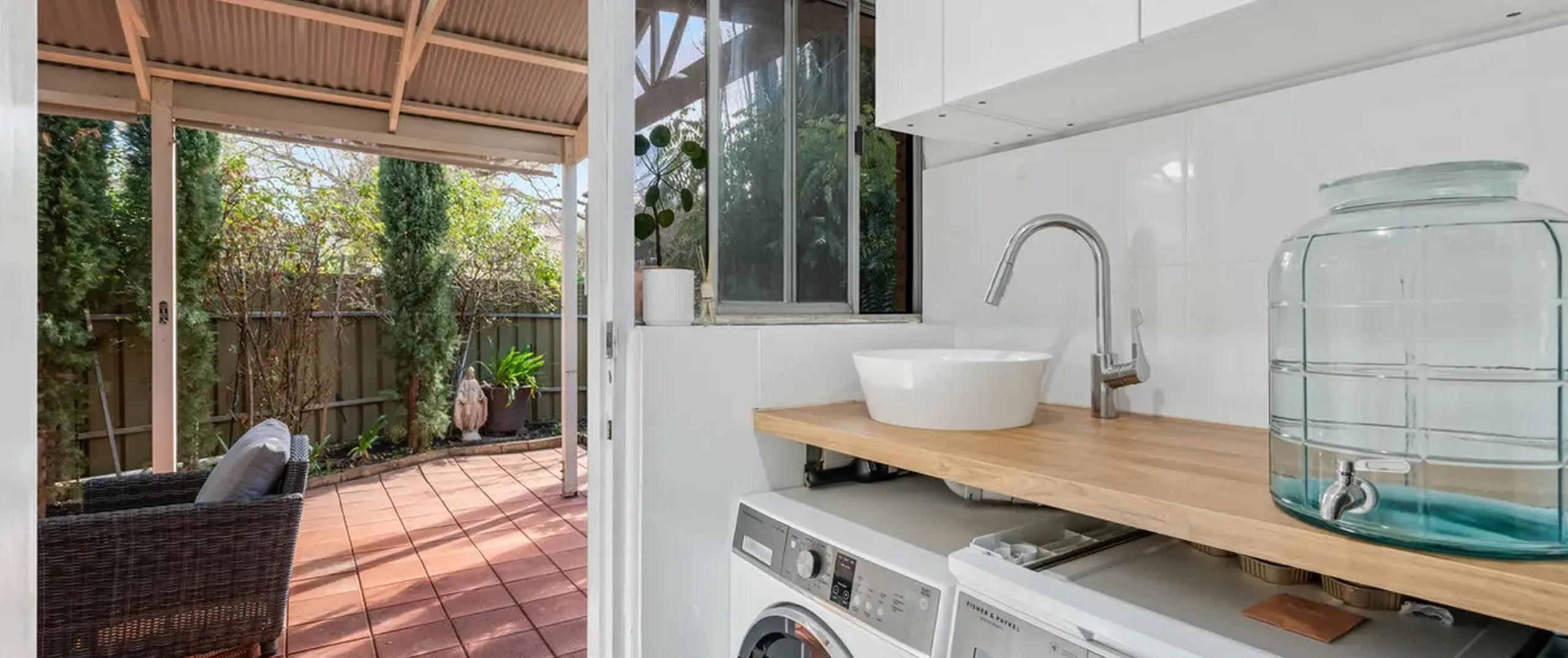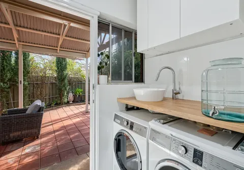 The bedrooms are generously proportioned, both complete with walk-in robes. The master bedroom overlooking the spectacular Linear Park and the second bedroom overlooking the landscaped private rear yard, while the central bathroom feels like a private retreat, finished with full height tiling, wall lighting, shower, bath and a separate toilet. A cleverly designed laundry with butler’s pantry function and direct outdoor access adds to the sense of effortless living.