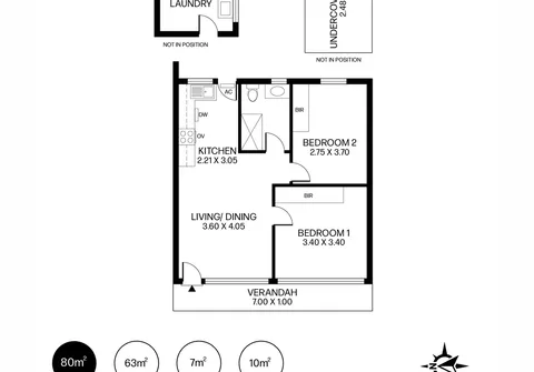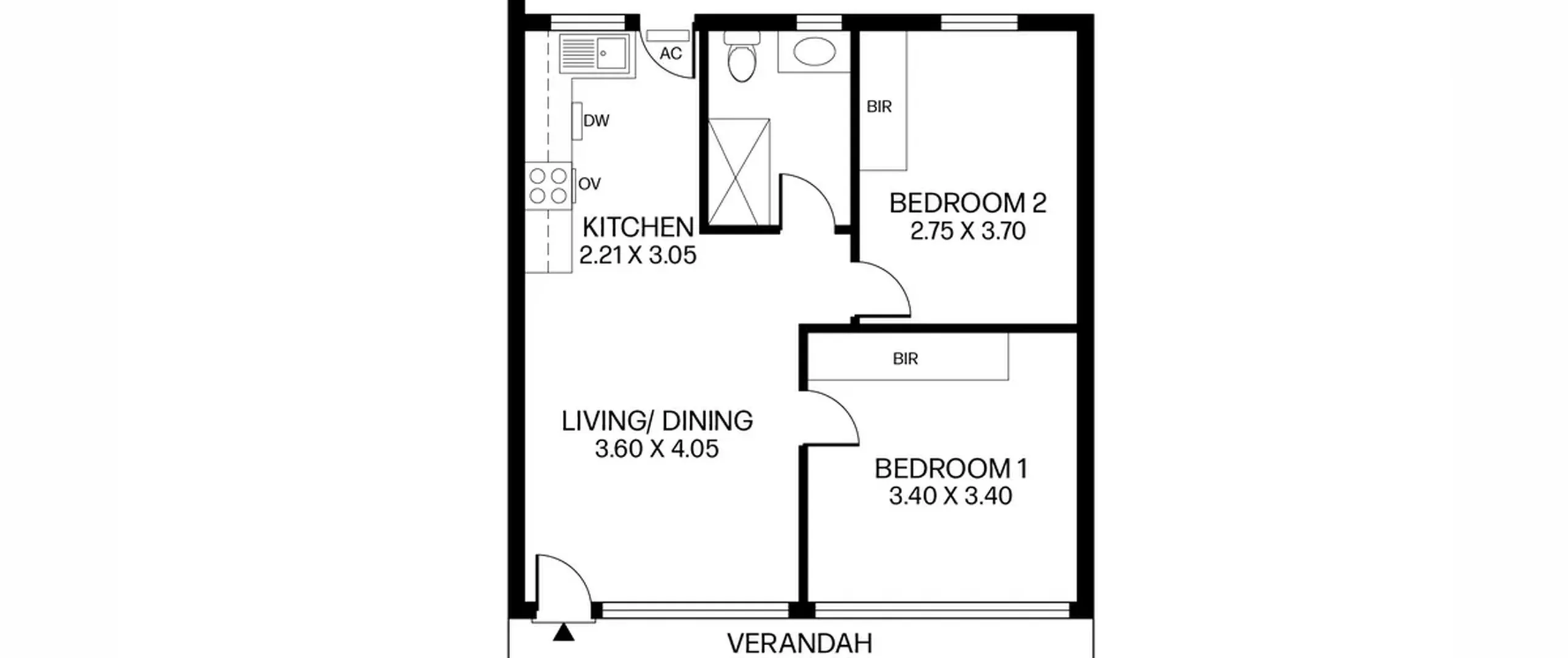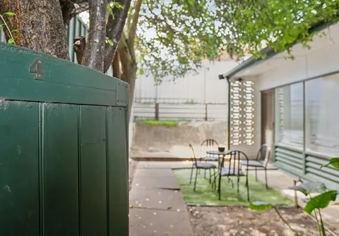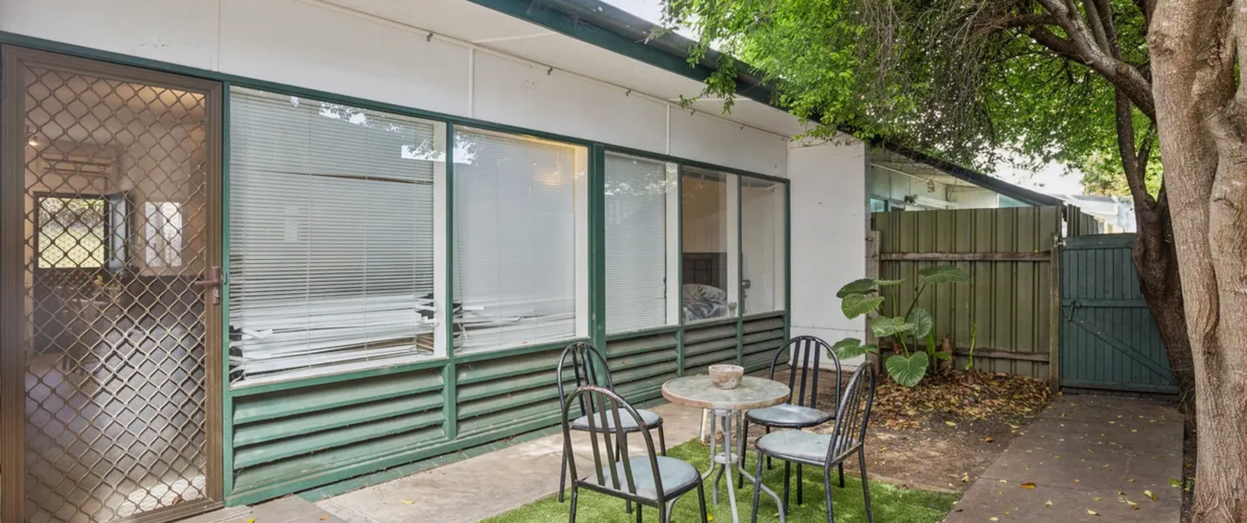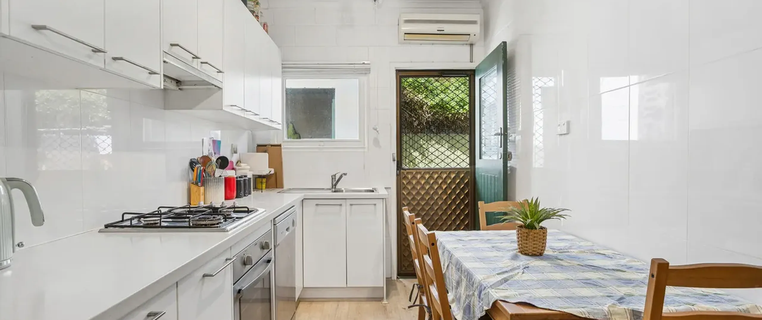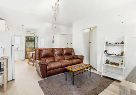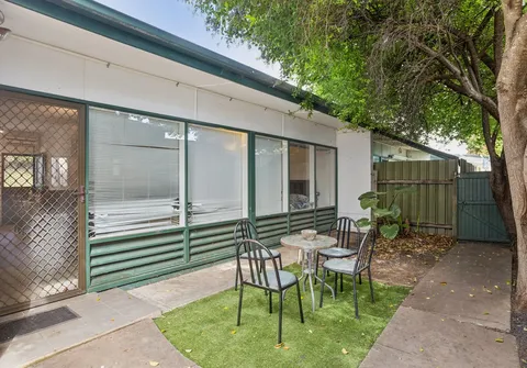 The layout features two bedrooms and one bathroom, complemented by a light-filled living and dining area with air-conditioning for year-round comfort. The well-appointed kitchen offers gas cooking and ample storage, while a separate laundry adds to the home’s convenience.