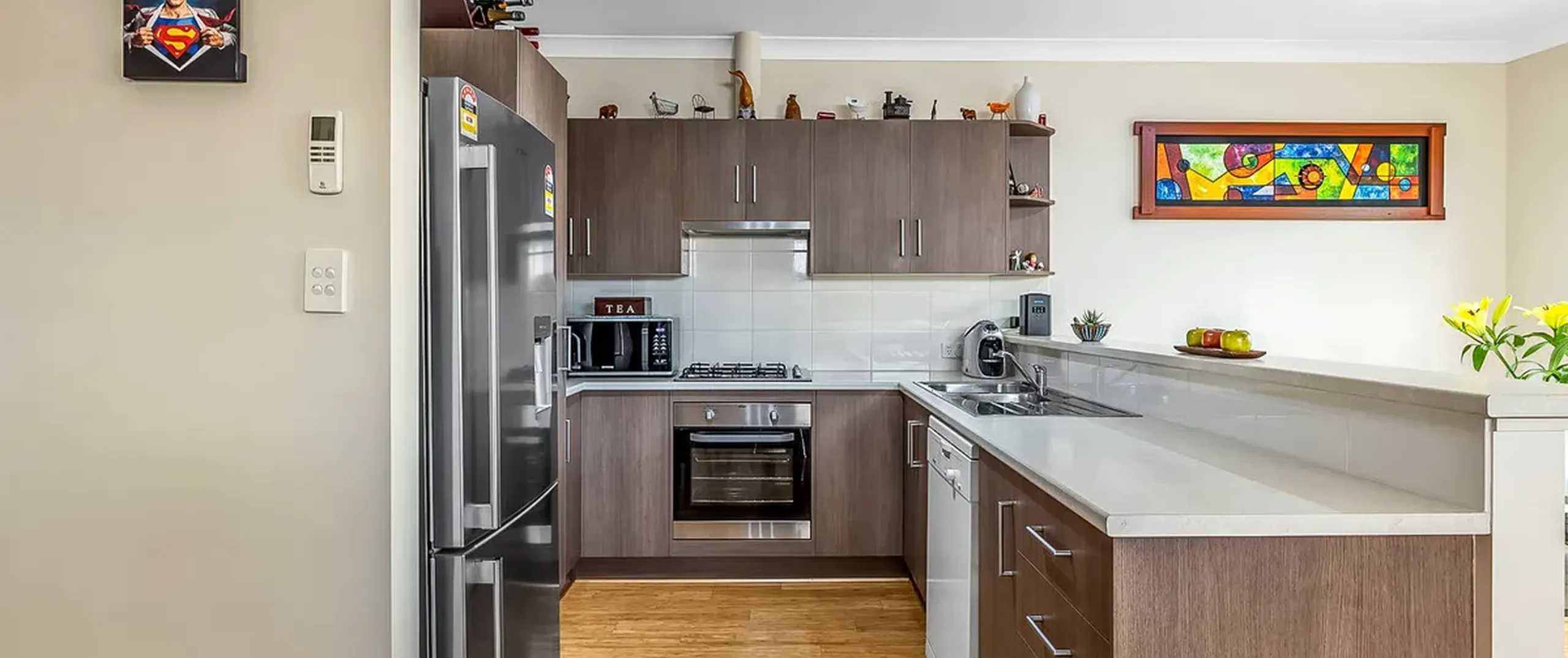 - Kitchen boasting stainless steel appliances including gas cooktop, electric oven, dishwasher and double sink