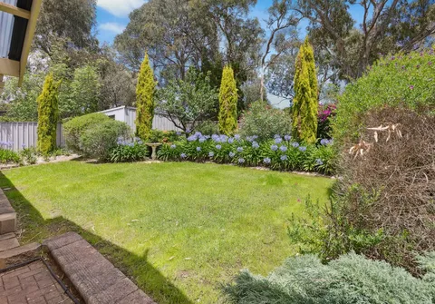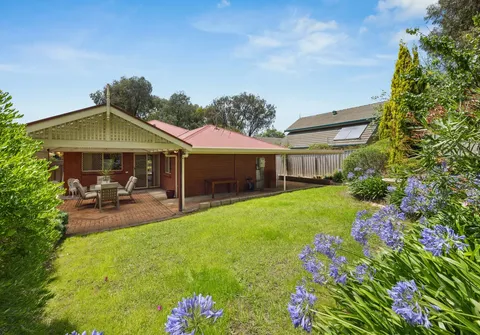 Transition outdoors to a sizable rear yard, featuring a pitched roof pergola—an ideal setting for outdoor relaxation and alfresco dining. The garden, graced with established plants and lush grass, creates a serene backdrop for your outdoor activities.