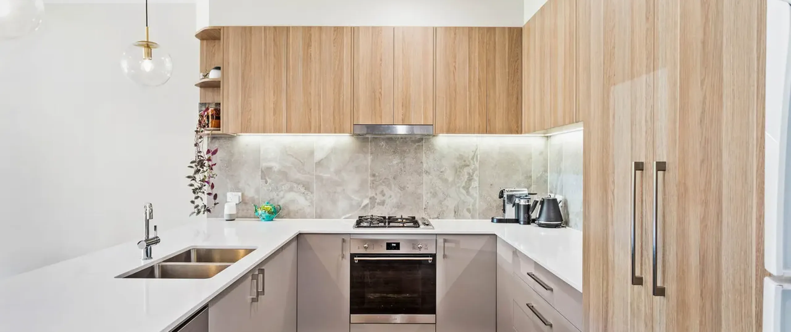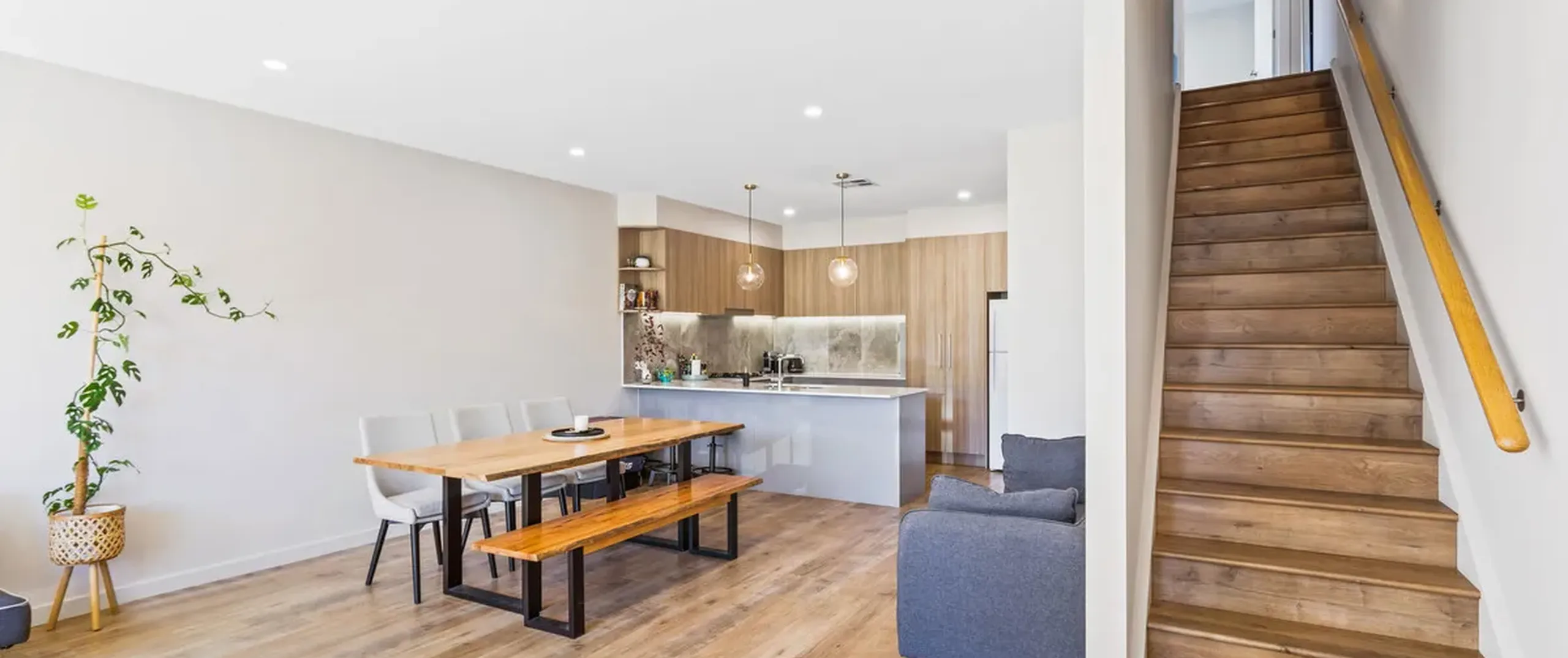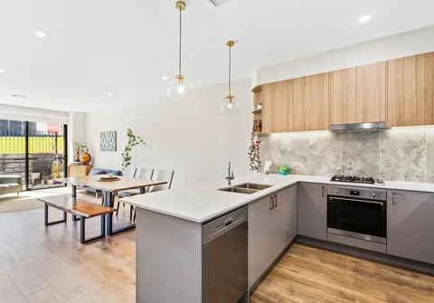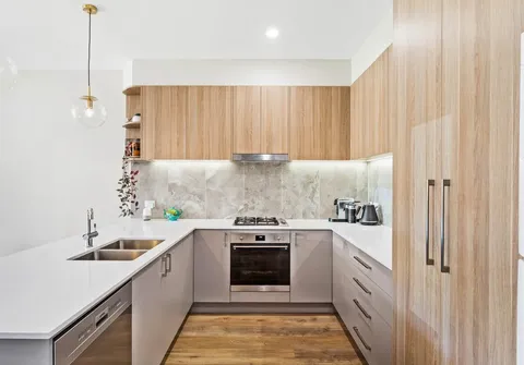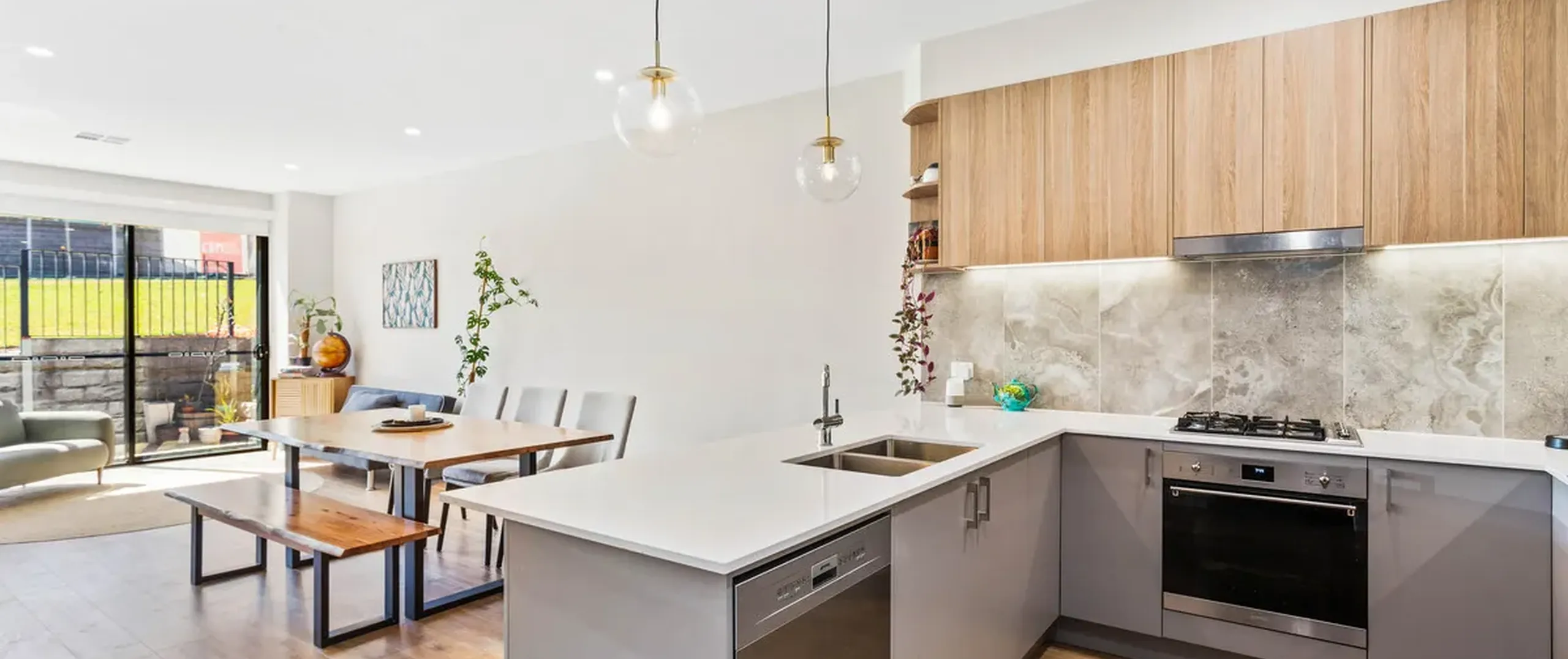 - Sleek on-trend kitchen with stainless steel dishwasher, oven and gas cooktop, feature tiled splash back, ample cupboard and bench space complete with breakfast bar with feature pendant lighting