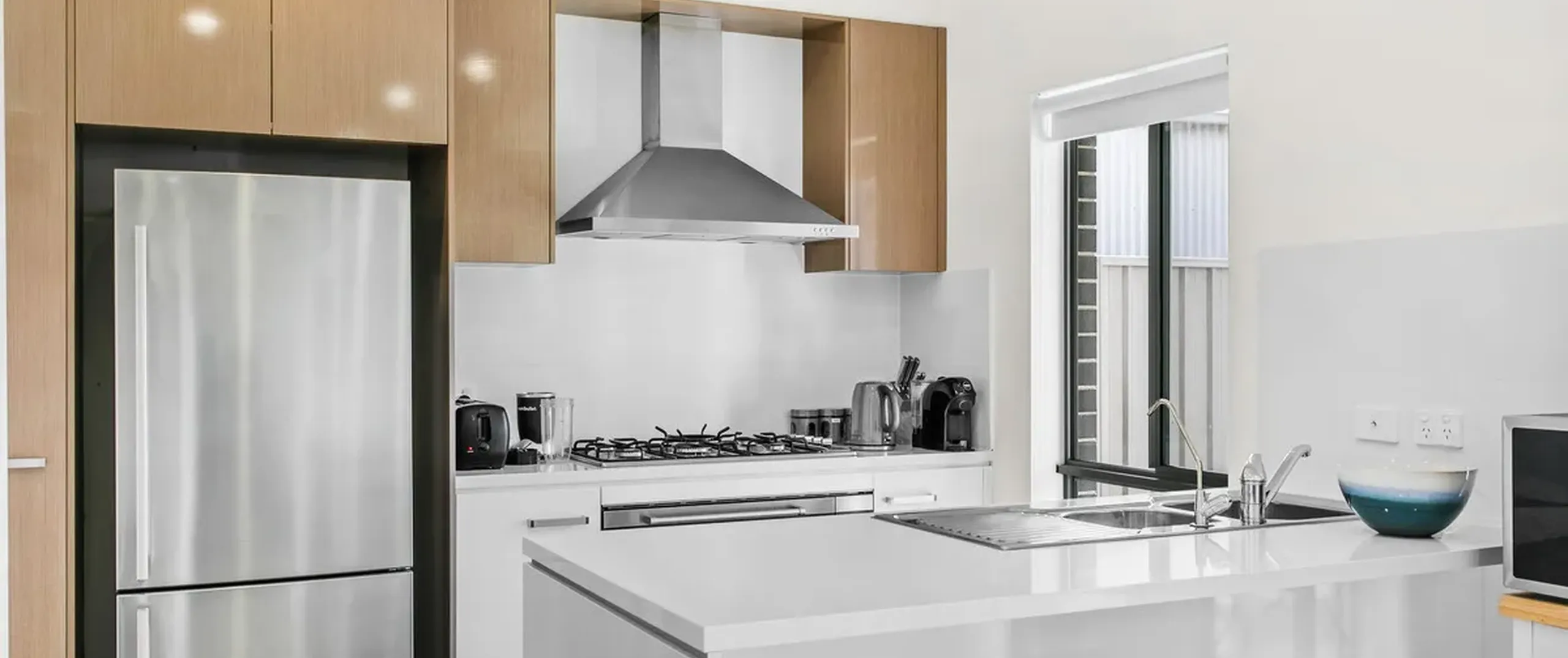 - Modern white kitchen featuring dual sinks, suite of stainless-steel appliances including oven, 5 burner gas cooktop, and dishwasher complete with ample storage and bench space with a breakfast bar