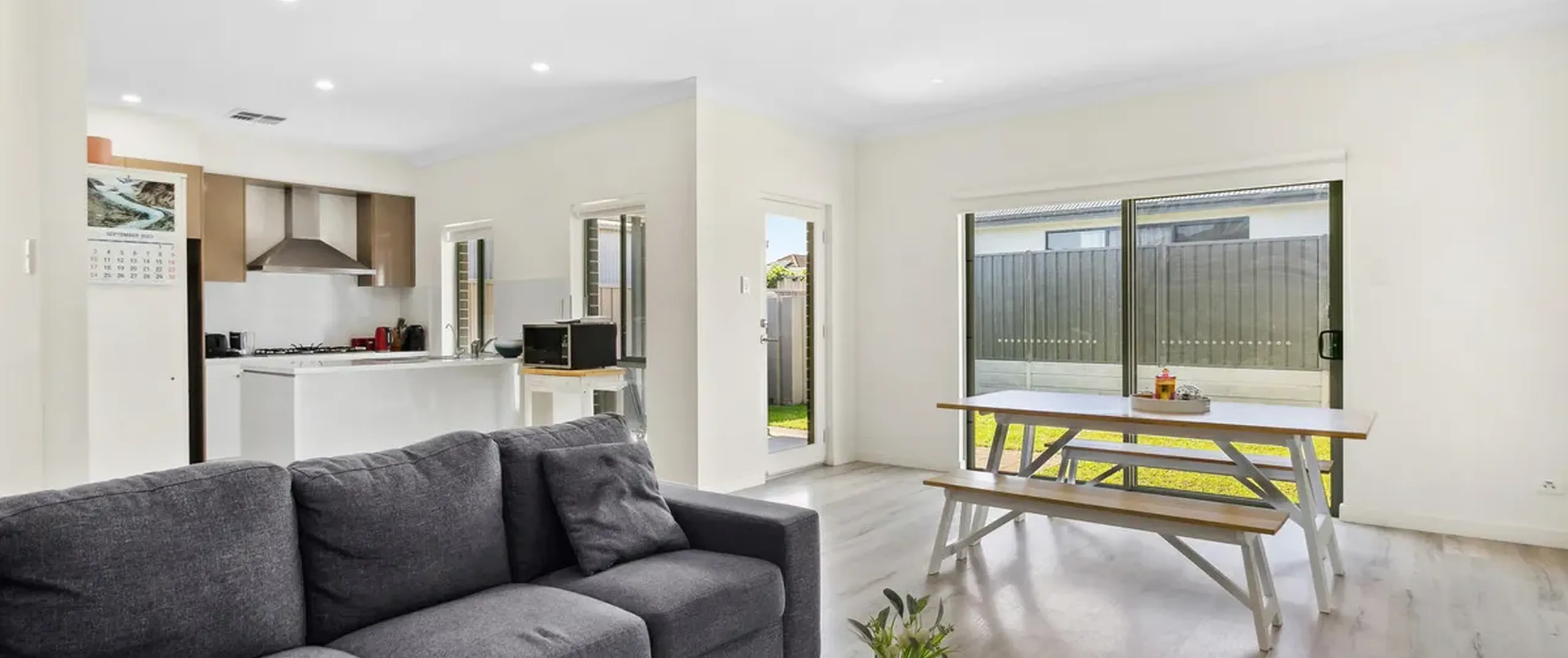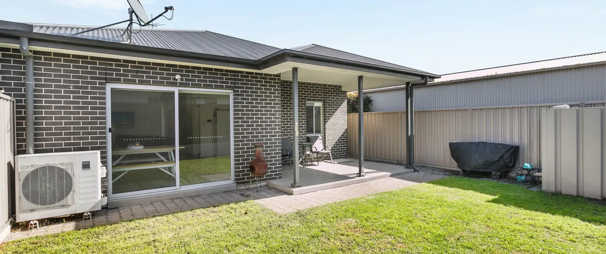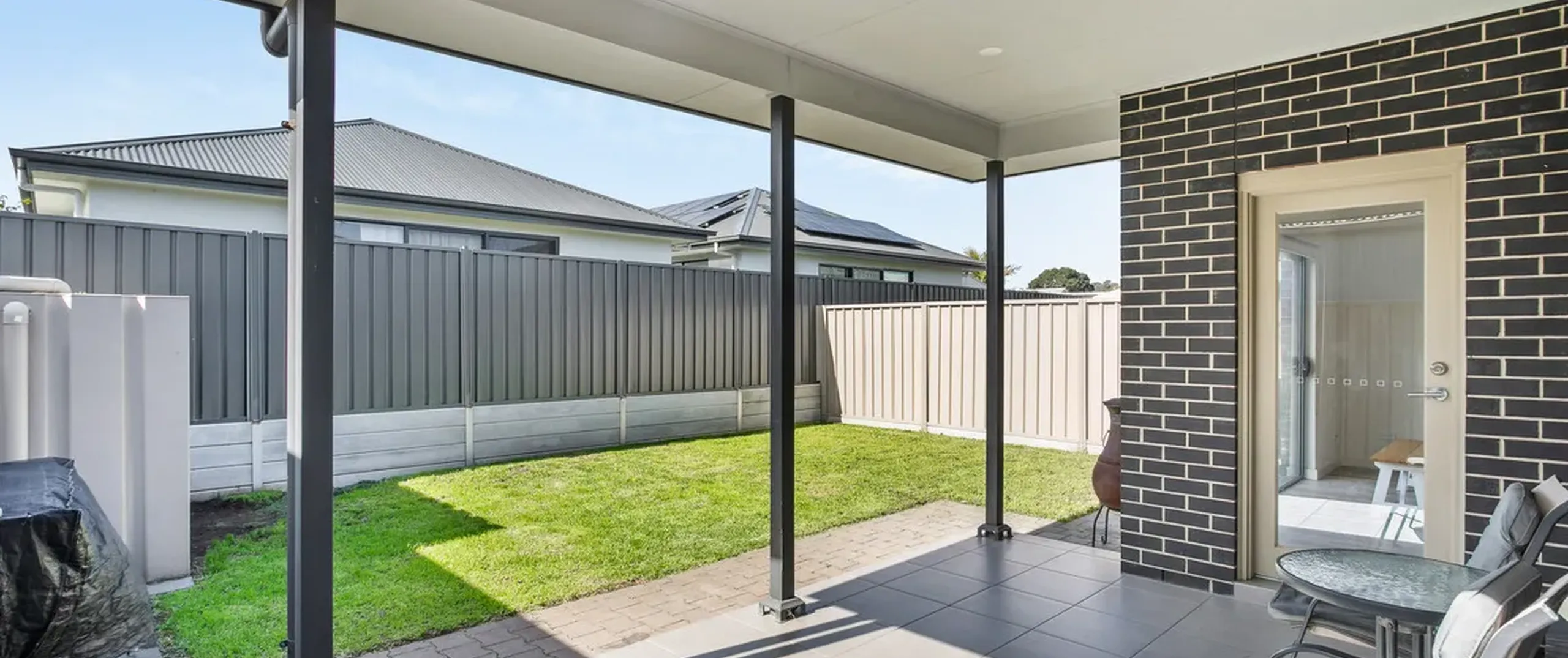 - Secure and fully fenced backyard with grass area perfect for kids and pets to enjoy